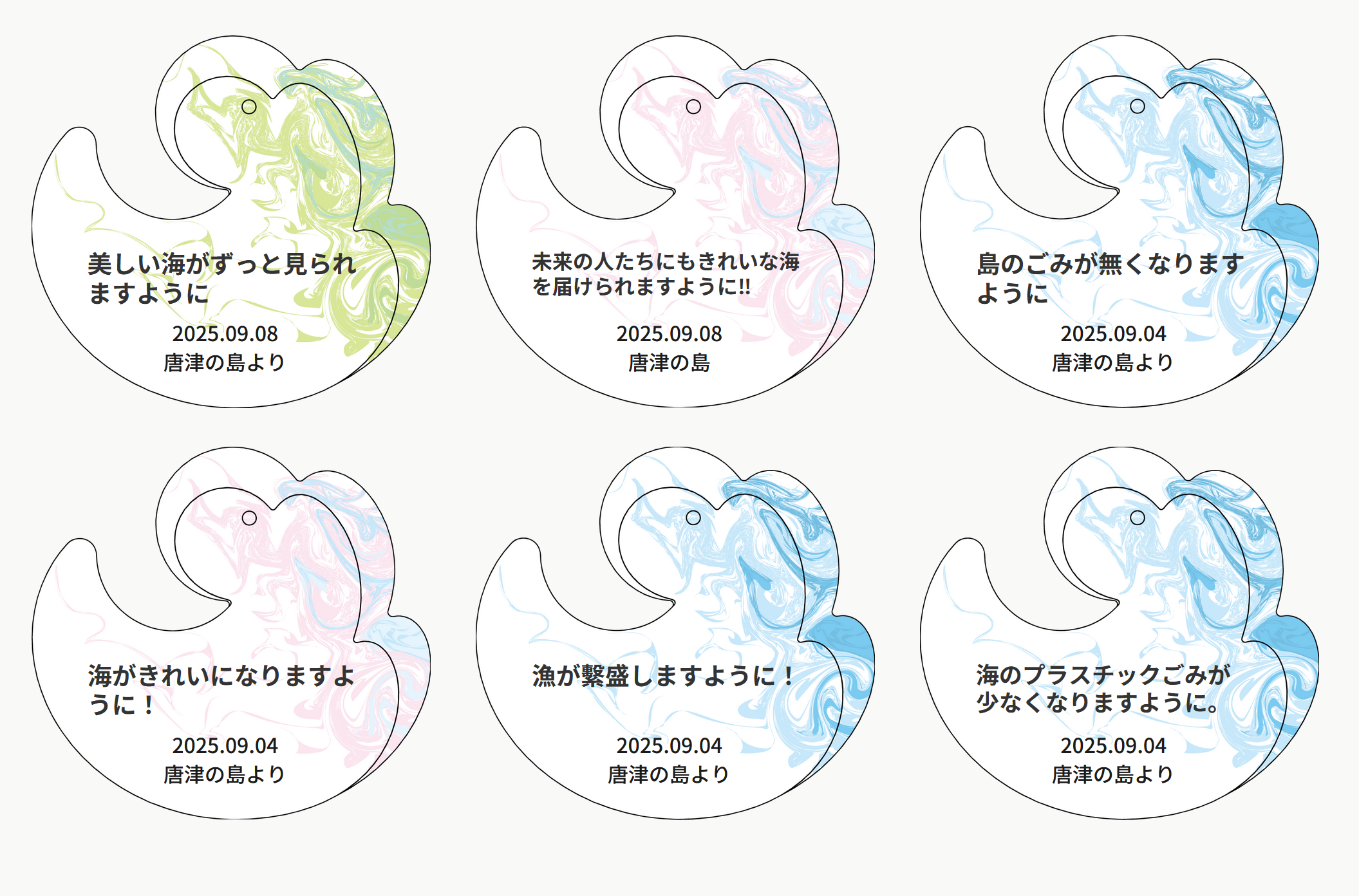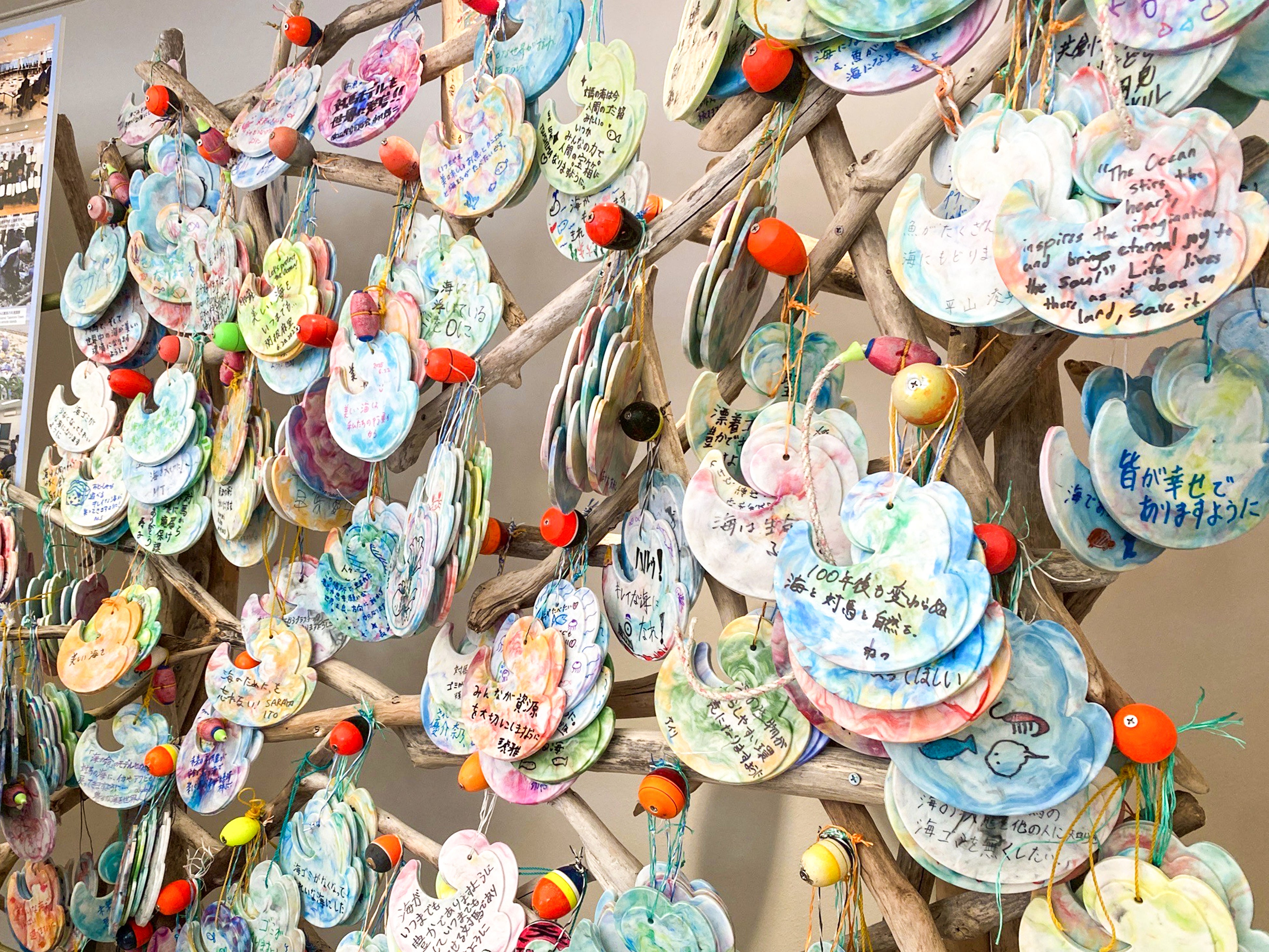 https://prcdn.freetls.fastly.net/release_image/142434/112/142434-112-244c2f009865df0a8394d3b73cda051a-3900×2925.jpg Wave ema exhibited at BLUE OCEAN DOME Wave Ema (Exhibition at the venue) Plastic bottle caps collected in Tsushima were recycled into wave-shaped votive plaques. Visitors and children wrote their “wishes for the ocean” on them, and approximately 300 of them were on display. This is an experiential upcycling experience where you come into contact with waste → learn → pledge to take action.