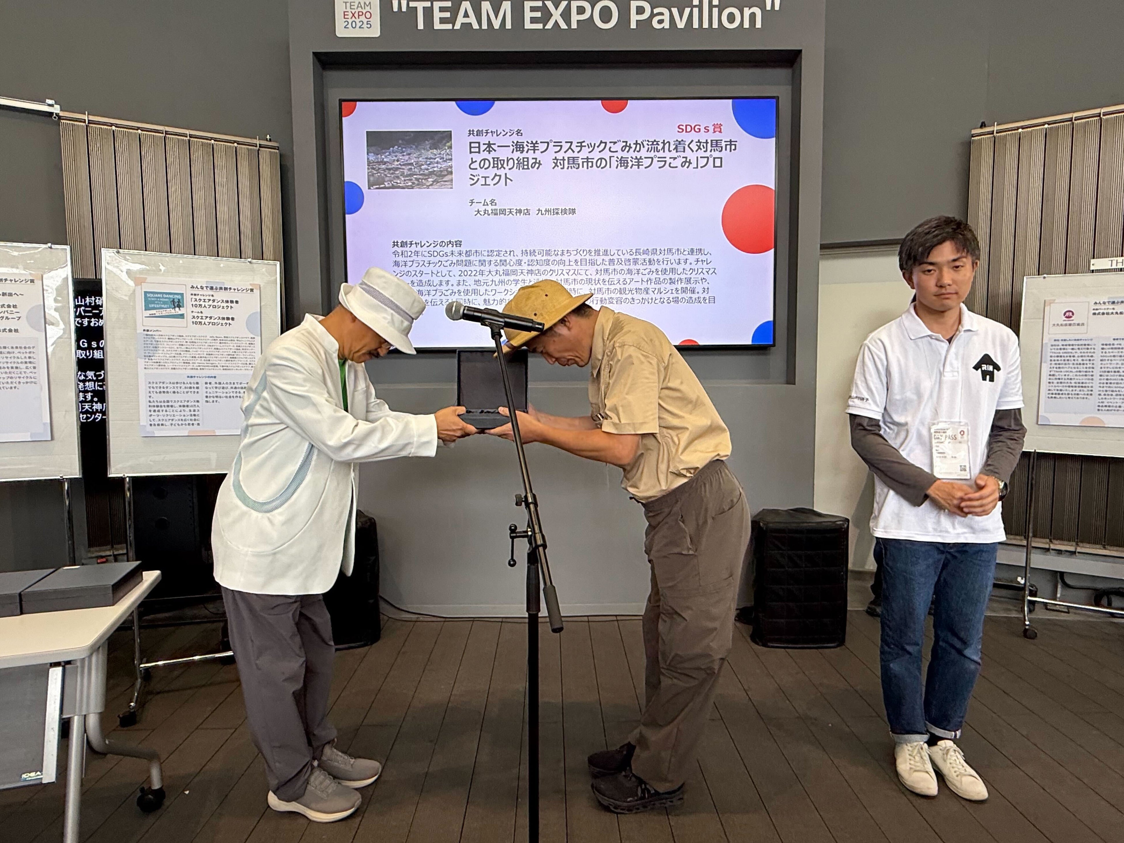 comprehensive collaboration on the SDGs reached the world Award Date: October 13, 2025 / “Team Expo” Award Award Winner: “Kyushu Exploration Team,” a volunteer team from Daimaru Fukuoka Tenjin Store, and Tsushima City’s “Marine Garbage Art Project” (Karatsu Farm & Food and Precious Plastic Karatsu collaborated through technical cooperation, lectures, and workshops.) Evaluated Points • Continuous efforts to address the problem of marine plastic waste in Tsushima • A