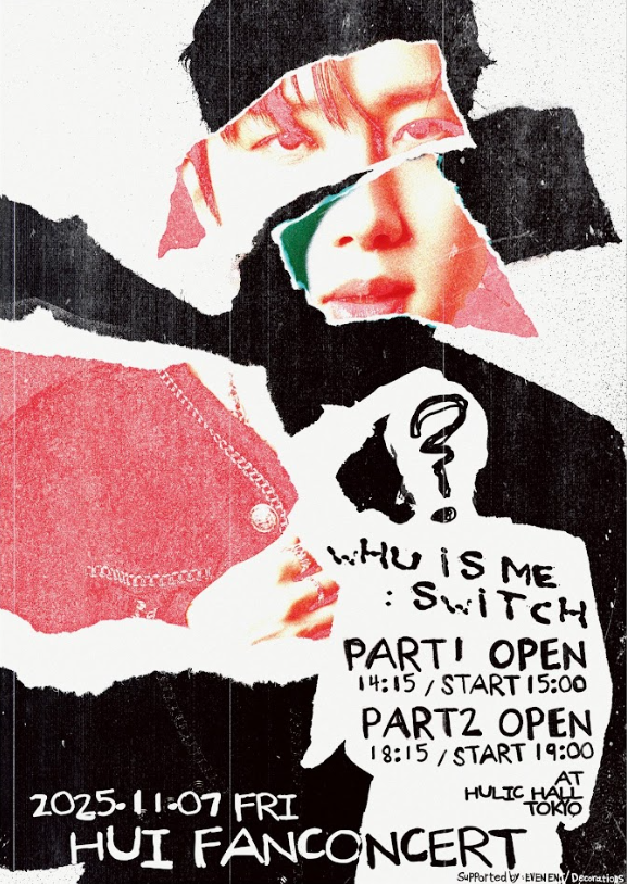 EVEN ENT Co., Ltd. Press release: October 26, 2025 To Members of the Press PENTAGON HUI’s first solo FAN-CON live show in Japan, “HUI_WHU IS ME : Switch,” to be held! Scheduled to be held at Hulic Hall Tokyo on Friday, November 7, 2025! HUI, leader of the popular Korean boy band PENTAGON and known for his outstanding singing and songwriting abilities, has finally announced that he will be holding his first solo FAN-CON concert in Japan.