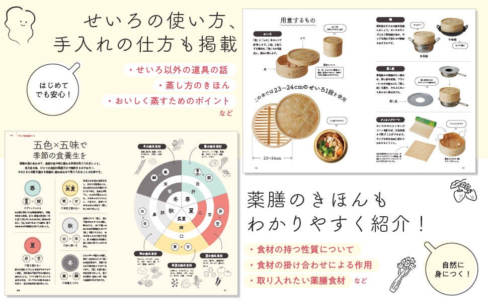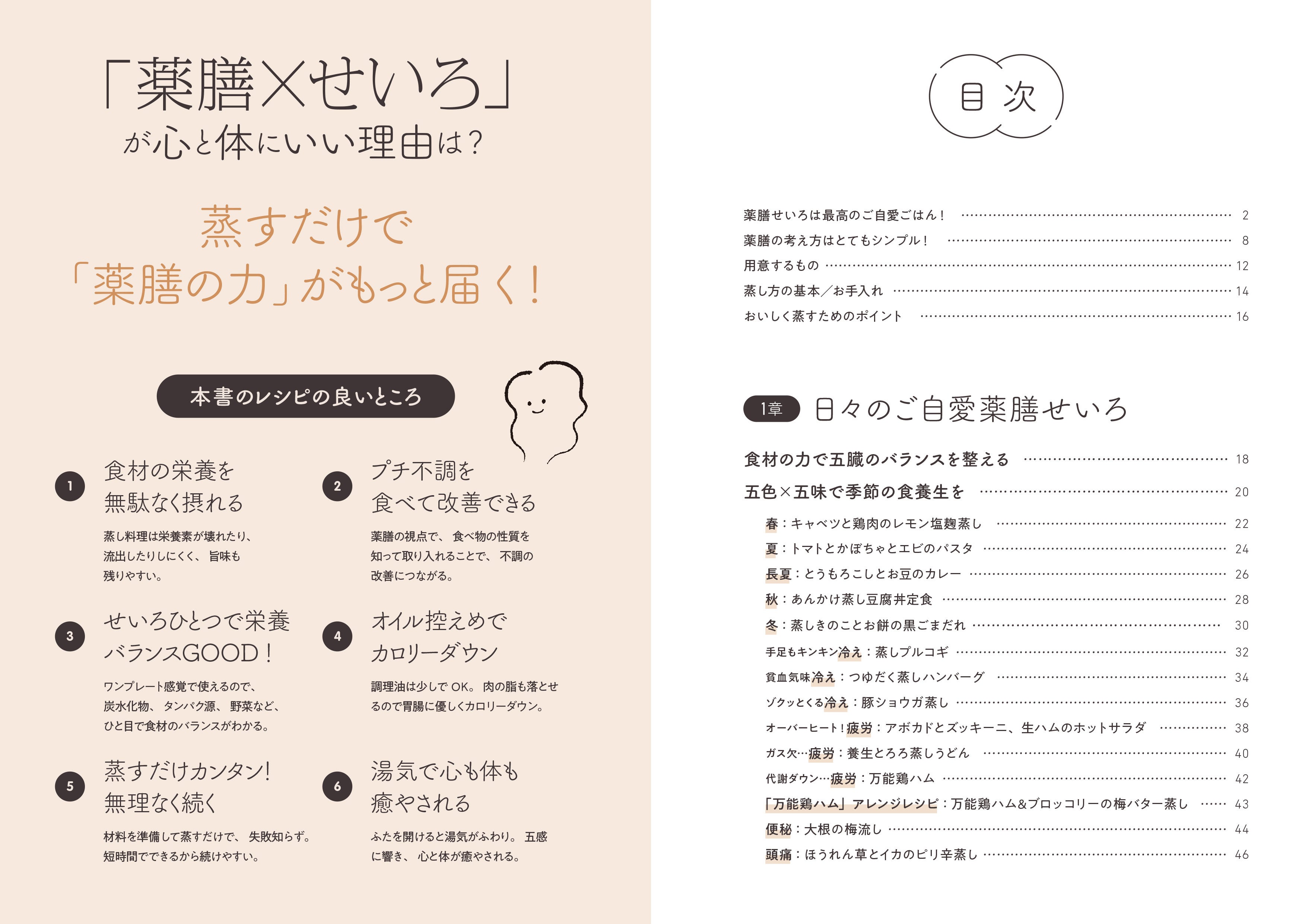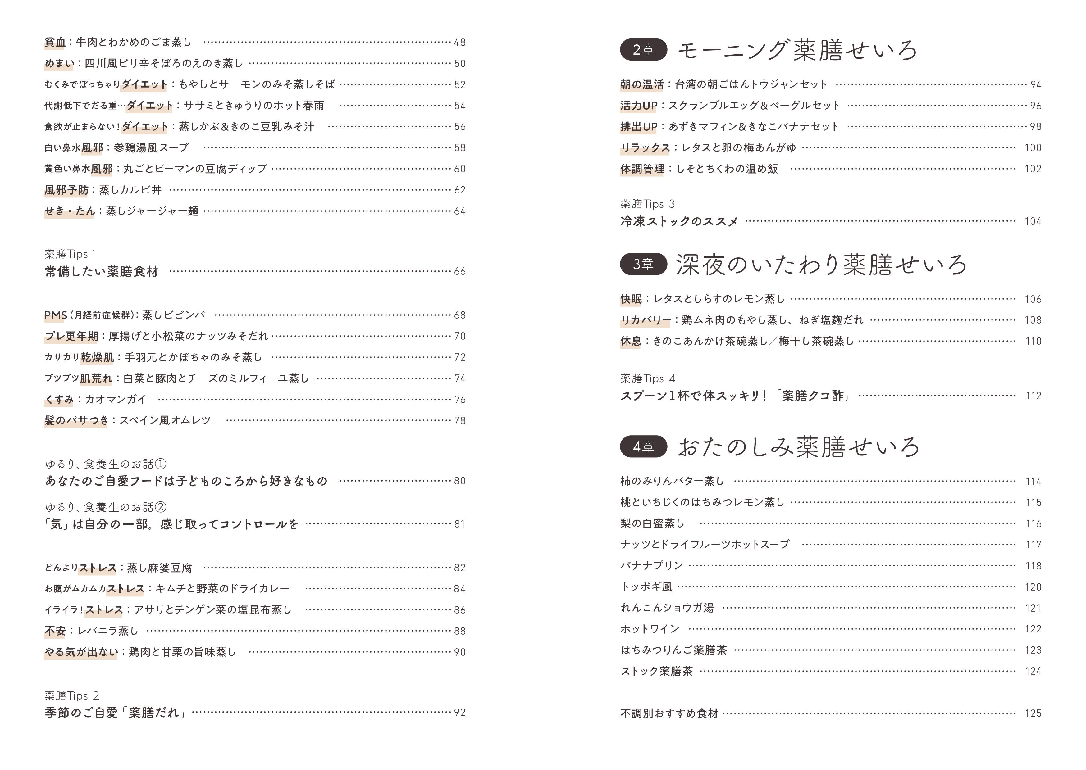 constipation… “Daikon radish with plum soup” For anemia… “Steamed beef and seaweed” For colds… “Easy ginseng chicken soup” For rough skin… “Steamed chicken wings and pumpkin for a glowing skin” For stress… “Steamed dry curry” For anxiety… “Steamed liver and leek” And more. We introduce ingredients and food combinations that will invigorate your mind and body based on your concerns. We also offer medicinal herbal teas and medicinal herbal teas for various occasions, such as “seasonal medicinal herbal teas,” “morning teas,” “late-night teas,” and “snack teas.”