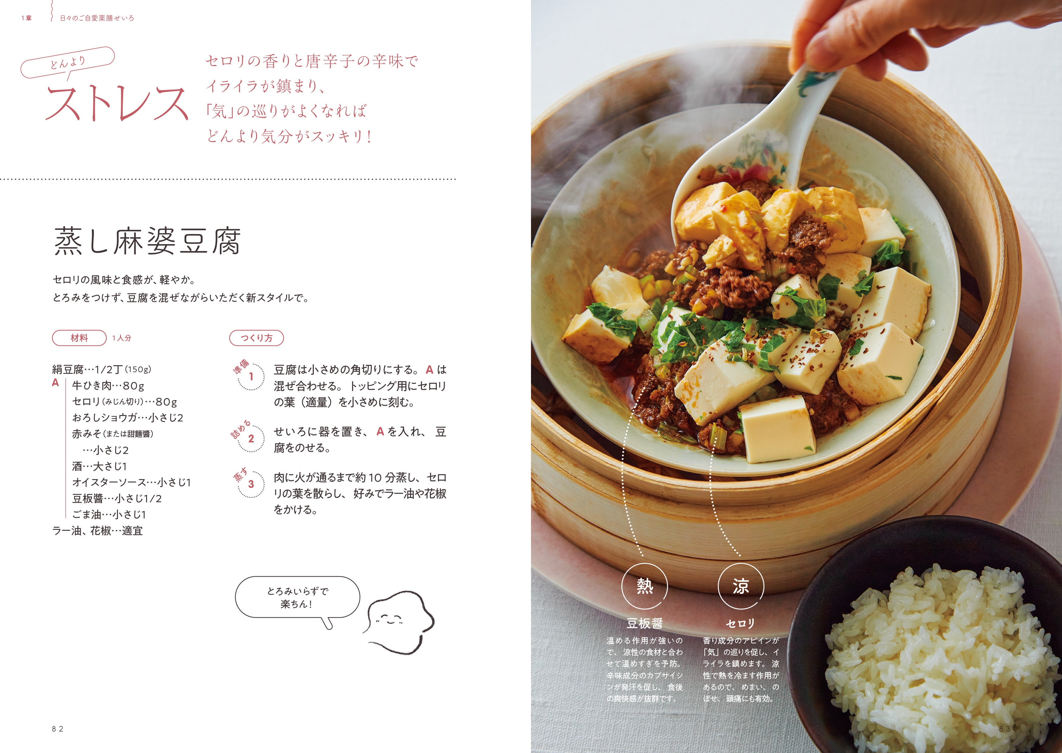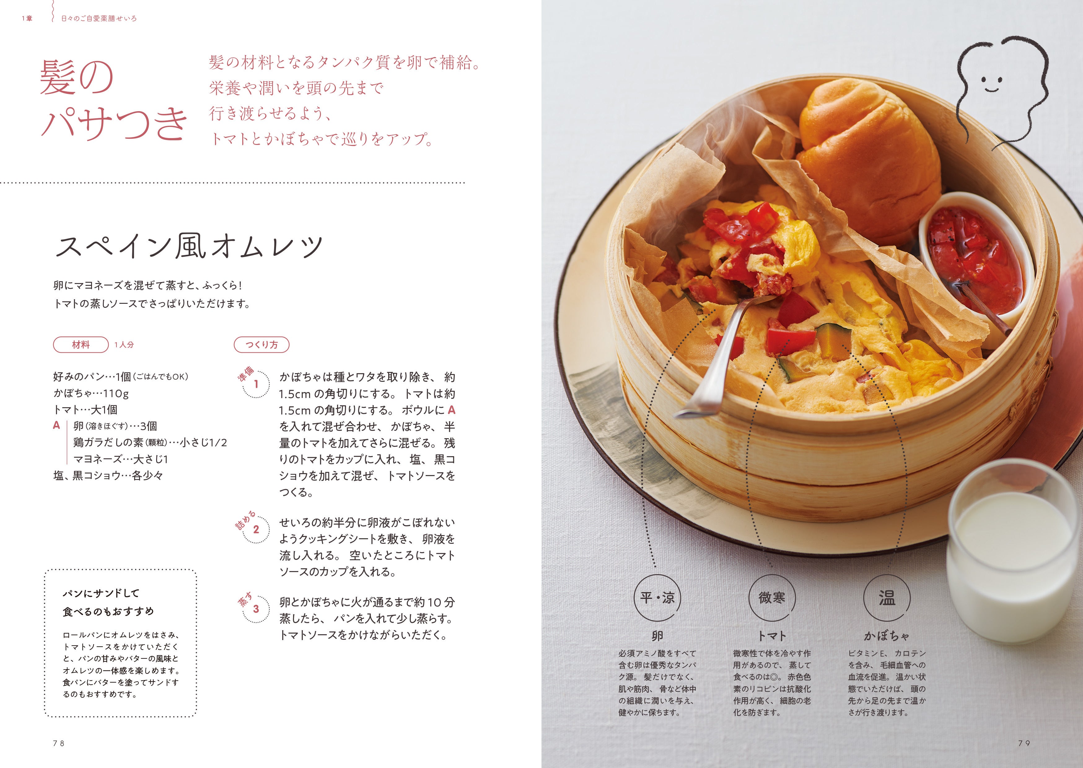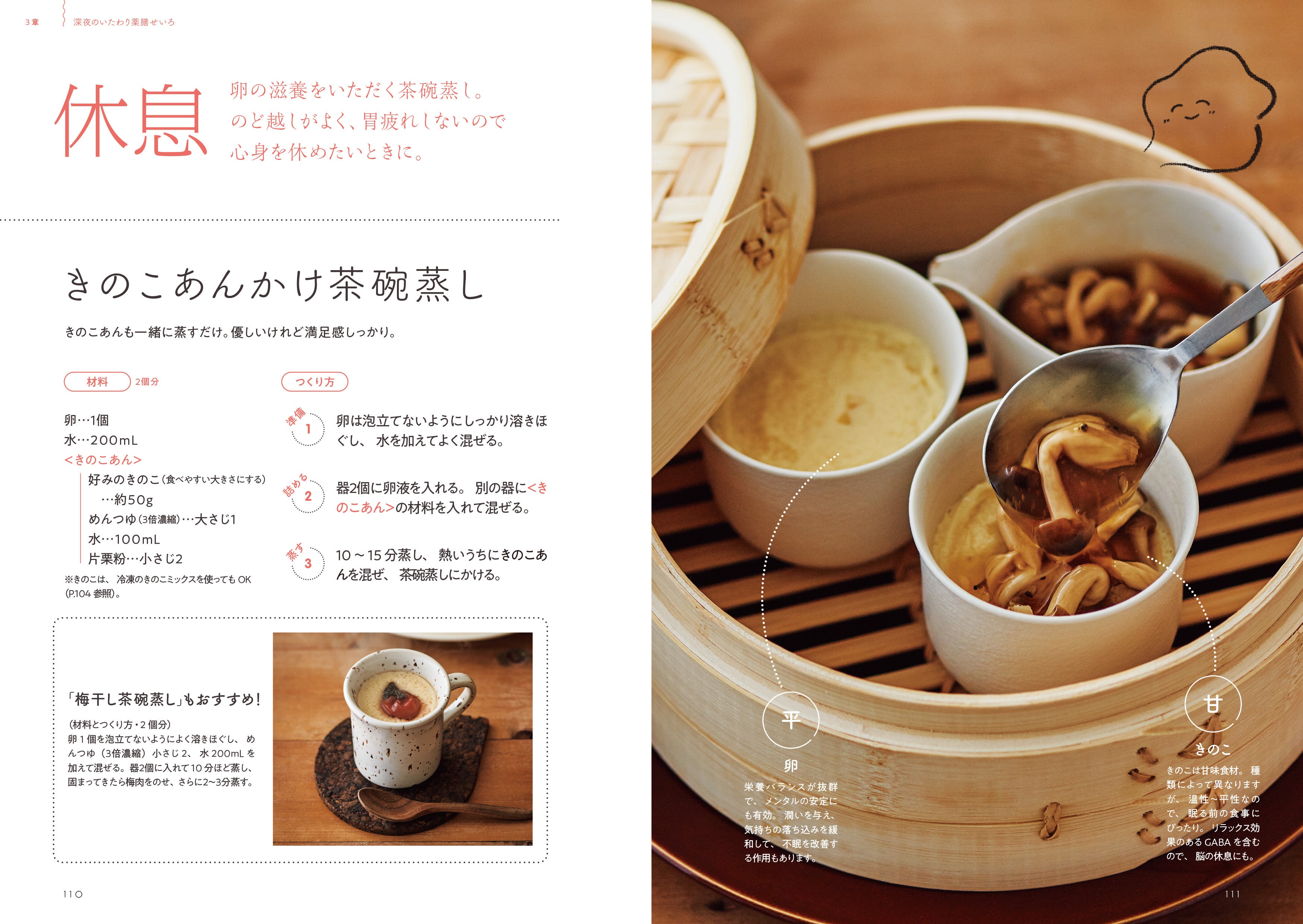 constipation… “Daikon radish with plum soup” For anemia… “Steamed beef and seaweed” For colds… “Easy ginseng chicken soup” For rough skin… “Steamed chicken wings and pumpkin for a glowing skin” For stress… “Steamed dry curry” For anxiety… “Steamed liver and leek” And more. We introduce ingredients and food combinations that will invigorate your mind and body based on your concerns. We also offer medicinal herbal teas and medicinal herbal teas for various occasions, such as “seasonal medicinal herbal teas,” “morning teas,” “late-night teas,” and “snack teas.”
