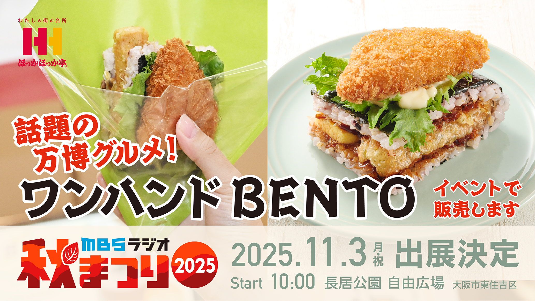 “Hokkahokkatei” booth at Nagai Park’s Jiyu Hiroba! Hokkahokkatei Headquarters Co., Ltd. (Headquarters: Osaka City, Osaka Prefecture; Chairman and CEO: Tatsuya Aoki), a pioneer in the takeout bento business, will be selling its “One-Handed BENTO,” a bento of the future that gained popularity among Generation Z and families with children through its exhibit at the Osaka-Kansai Expo , at the “MBS Radio Autumn Festival 2025” (sponsored by MBS Radio), an event to be held at Nagai Park’s Jiyū Hiroba on Monday, November 3, 2025 (national holiday).