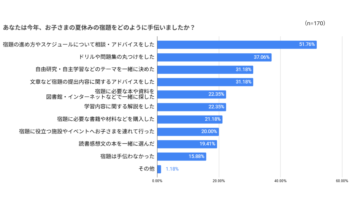 https://prcdn.freetls.fastly.net/release_image/7006/17954/7006-17954-72c077fe997299f8ba4a7a789fe55f5d-1200×700.png First, we asked how much help they had with their children’s homework. 78.2% of respondents answered that they had helped their children with their homework in some way. 26.5% said they had helped more than half of the time, which was a not insignificant result. What kind of support did you provide specifically? 4. How did you help your child with their summer homework this year?