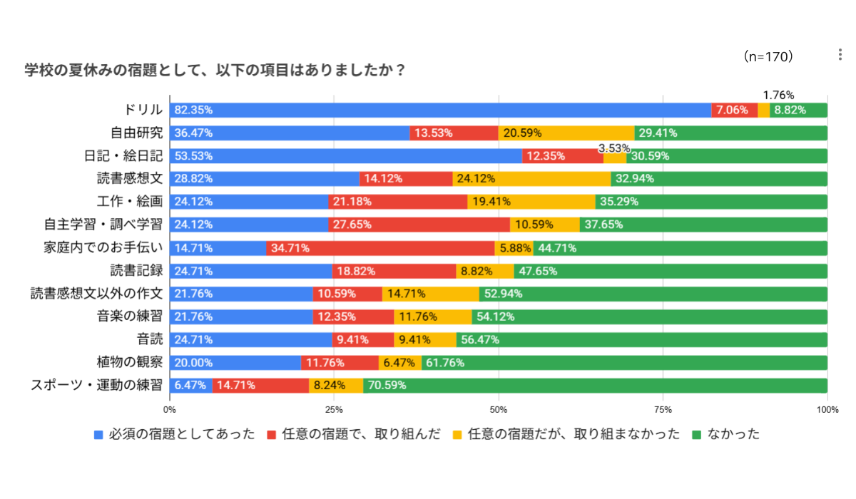 https://prcdn.freetls.fastly.net/release_image/7006/17954/7006-17954-4aa4955de3359c319eb78eeb12f5cc6c-1200×700.png First, we asked parents with children in grades 1 through 3 of junior high school what kind of homework their school assigned them during the summer vacation of 2025. The most common answer was “drills,” with over 90% of respondents saying they had required or optional homework. When we think of standard summer vacation homework, we imagine “independent research” and “book reports.” However, 70% of respondents said they had been assigned “independent research,” and only about half of those said it was required. While 67% of respondents said they had been assigned “book reports,” ranking fourth overall, only 43% said they had actually worked on it, placing it eighth out of all homework they had worked on.