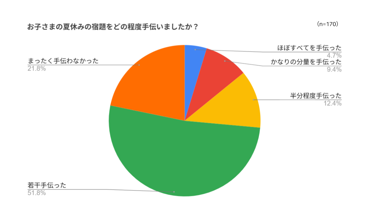 https://prcdn.freetls.fastly.net/release_image/7006/17954/7006-17954-a3b5b31c0eb398ac857a3516c088f52e-1200×700.png When asked how well their children were managing their homework, over 40% of respondents answered, “I understood the content of the homework, but I couldn’t manage their progress,” which was about 10% more than those who answered, “I was able to manage my own progress.” Depending on the child’s age, it can be quite difficult for children to complete a wide variety of homework on their own during the summer vacation. This is where parental support becomes necessary. To what extent and in what ways did Yomelba members help their children with their homework? 3. How much did you help your child with their summer homework?