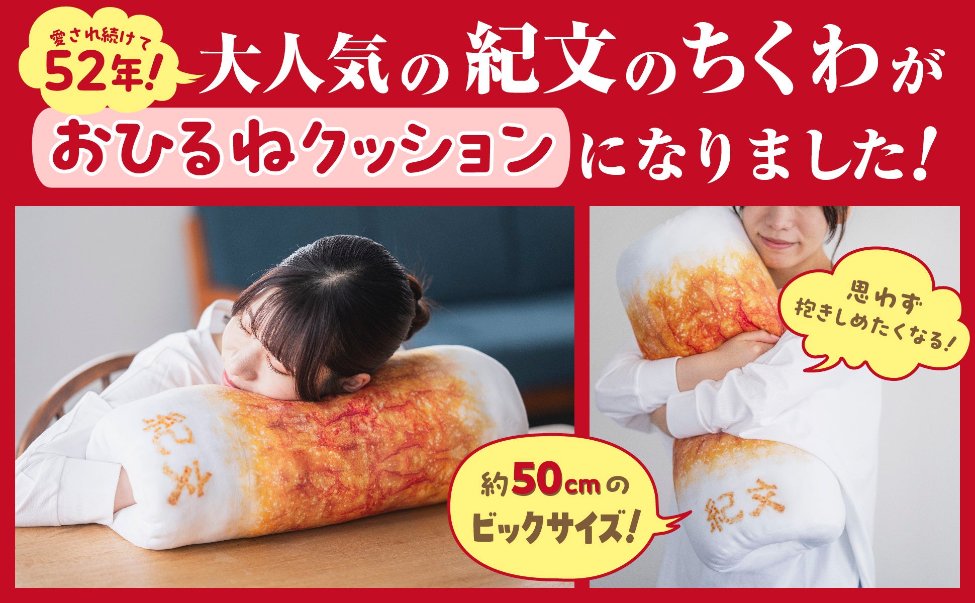 https://prcdn.freetls.fastly.net/release_image/129409/203/129409-203-223401e903db50cf8cec10a4d4612d78-1797×2700.jpg 【Chikuwa Cushion Special Features】 POINT 1: You can put your hand through the hole! POINT 2: A large size equivalent to about 40 of our long-selling “Takebue(R)” flutes! POINT 3: Fluffy and chewy texture! POINT 4: Recreates the crispy “Kibun” branding iron! Not only is it a great companion for naps, it’s also sure to be a great addition to your room’s decor or a soothing treat when you’re tired. Chikuwa, a long-time favorite at the dinner table, is a great treat to have by your side even when you’re not eating! It comes with a booklet containing little-known chikuwa trivia and chikuwa recipes recommended by our staff. *Chikuwa cushion size: approx. 50cm x 20cm