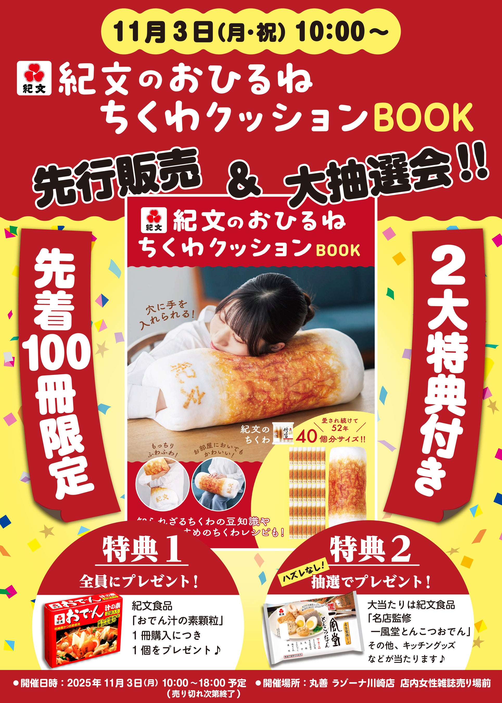 URL: https://prcdn.freetls.fastly.net/release_image/129409/203/129409-203-c0108de58d7f67b8aed8bfe5ec1766c7-1929×2700.jpg On Monday, November 3rd (national holiday), we will be holding a “Pre-sale & Grand Raffle” limited to the first 100 copies. All participants will receive two great prizes: Kibun Foods’ “Oden Soup Base Granules,” and a chance to win prizes such as “Ippudo Tonkotsu Oden Supervised by a Famous Restaurant” in a raffle. *One “Oden Soup Granules” will be given as a gift with each purchase of a book. Limited to the first 100 books! Comes with two great bonuses Pre-sale of “Kibun’s Nap Chikuwa Cushion Book” & Grand Raffle ◎Date and Time: Monday, November 3, 2025 (National Holiday), 10:00 AM – 6:00 PM (Ends when sold out) ◎Venue: Maruzen Lazona Kawasaki Store, in front of the women’s magazine section Loved for 52 years! Kibun’s popular chikuwa is now available as a cushion!