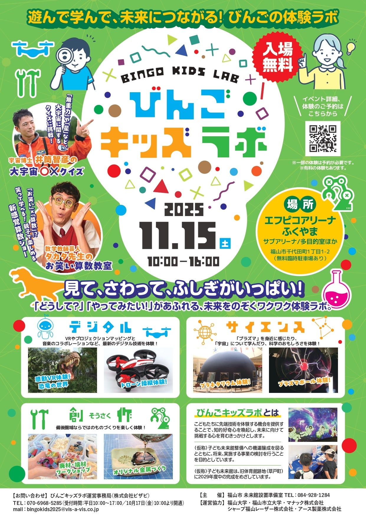 https://www.city.fukuyama.hiroshima.jp/soshiki/miraikansecchi/ Contact us [Inquiries] Bingo Kids Lab Management Office (Visavi, Inc.) TEL: 070-6968-5285 (Hours: Weekdays 10:00-17:00 / Opens October 17th (Friday) at 10:00) mail:bingokids2025@vis-a-vis.co.jp
