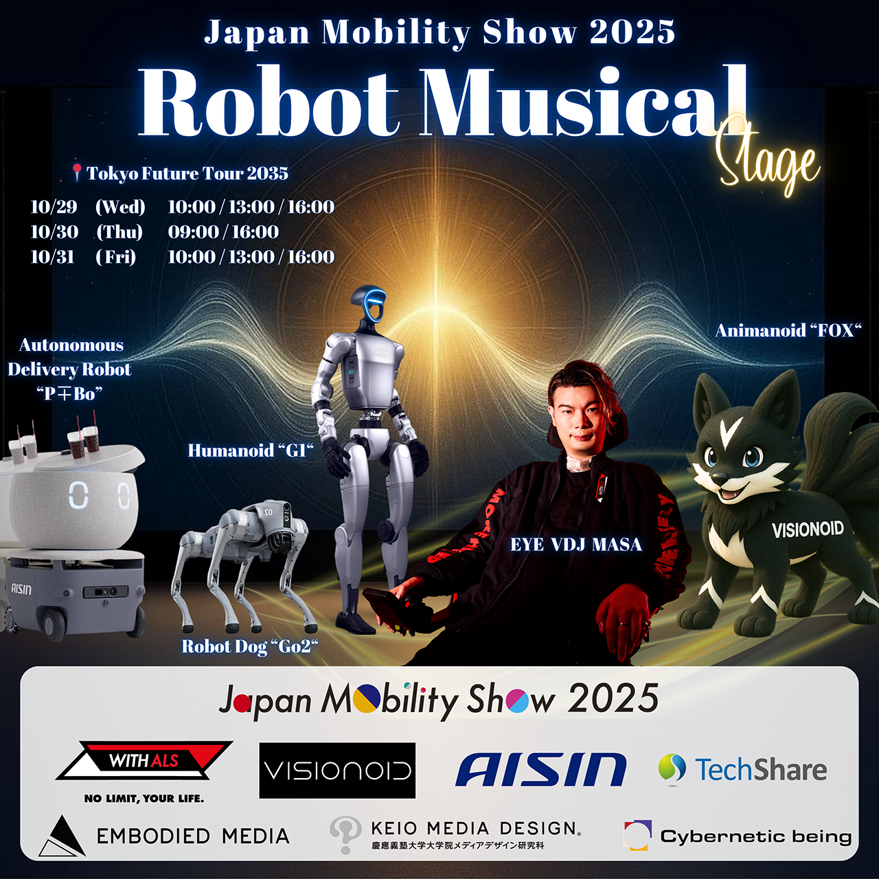 “brainwave-activated robot arm” unveiled at the Osaka-Kansai Expo’s “Sports Future Lab,” and This project explores the question: “To what extent can technology express human emotions and will?” [Exhibition overview] Event name: Japan Mobility Show 2025 Exhibition area: “Tokyo Future Tour 2035” entrance Exhibition Contents: EYE VDJ MASA (Masatane Muto) x Next-Generation Animoid “VISIONOID “FOX”” Body-enhancing performance using brainwave-controlled robotic arms, audiovisual effects via gaze control, and animanoid reactions. Collaboration: Masatane Muto (Augmented Body Artist/Representative Director of WITH ALS General Incorporated Association) Event Period: Wednesday, October 29, 2025 – Sunday, November 9, 2025 [Robot Musical] Held daily during the event period. [EYE VDJ MASA (Masatane Muto) Performance Date and Time] October 29th (Wednesday) 10:00 / 13:00 / 16:00 Press Day October 30th (Thursday) 10:00 / 16:00 Press day October 31st (Friday) 10:00 Special invitation day 13:00 / 16:00 Public open day Venue: Tokyo Big Sight