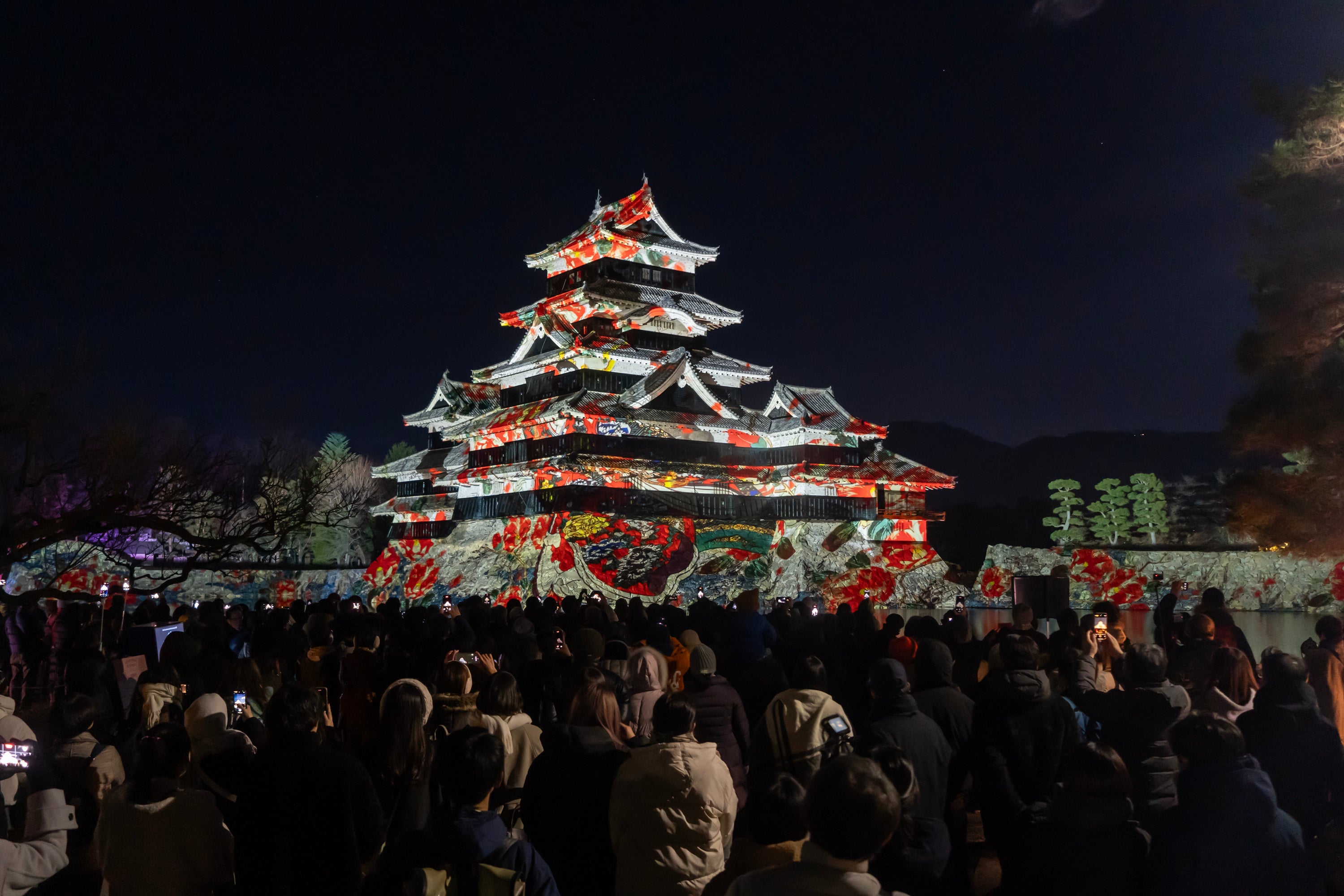 Corporation. “2025-2026” will be held at Matsumoto Castle Park (Matsumoto City, Nagano Prefecture) from Saturday, December 13, 2025 to Sunday, February 15, 2026. (Organizer: Castle Town Matsumoto Festa Organizing Committee) This event will project dynamic and fantastical projection mapping images onto the keep and stone walls of Matsumoto Castle, one of the five remaining National Treasure castle towers and the oldest of its five-story, six-story towers. These images include nishiki-e (colored woodblock prints) from the Matsumoto City Museum, depicting the commercial capital of Matsumoto, gorgeous folding screen paintings, motifs of Matsumoto’s unique traditional crafts, such as Matsumoto temari (balls) and lanterns, as well as spring cherry blossoms and flowers from the Northern Alps. In addition, you can experience a variety of light art, including interactive content on the garden paths, projection mapping at the castle gate, and illuminations of Matsumoto Castle Park. Admission is free and no prior registration is required. During the event, projection mapping performances with different themes will be available: from Saturday, December 13, 2025 to Wednesday, January 7, 2026; from Thursday, January 8 to Wednesday, January 28, 2026; and from Thursday, January 29 to Sunday, February 15, 2026. Please enjoy the magnificent projection mapping that decorates Matsumoto Castle’s main tower in winter.
