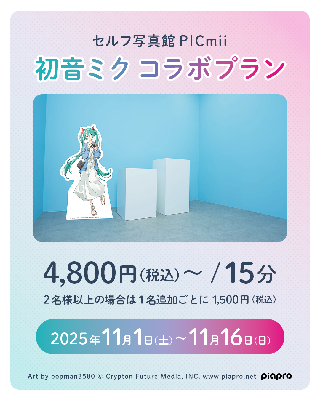 Pickhive Co., Ltd. Press Release: October 27, 2025 [Hatsune Miku x Selfie Photo Studio PICmii] A limited-time special studio in conjunction with Kitamura Camera’s collaboration project has opened at the Shinjuku store. Also featuring a life-size panel featuring an original Hatsune Miku design by popman3580 Pickhive Self-Photo Studio PICmii (pronounced: Pick Me), operated by Pickhive Co., Ltd. (Headquarters: Shinjuku-ku, Tokyo; President and COO: Yoshinori Osako), a member of the Kitamura Holdings Group, will be offering a special studio in collaboration with virtual singer “Hatsune Miku” at its PICmii Shinjuku store, located on the 7th floor of Kitamura Camera in Shinjuku, from Saturday, November 1, 2025, to Sunday, November 16, 2025. This project is also being held in conjunction with the Kitamura Camera x Hatsune Miku collaboration event being held at Kitamura Camera Shinjuku. The collaboration studio will be located in Studio A, which features a sky blue background that is popular on PICmii, and will feature a life-size Miku panel designed by popman3580, inspired by “Hatsune Miku x photo.” Character panels featuring miniature character illustrations by Mebu Sakai will also be available for use as props for photography. In addition, customers who take photos using the Hatsune Miku collaboration plan will receive an acrylic photo card featuring an original illustration of Hatsune Miku and other Piapro characters (Hatsune Miku, Kagamine Rin, Kagamine Len, Megurine Luka, MEIKO, and KAITO).