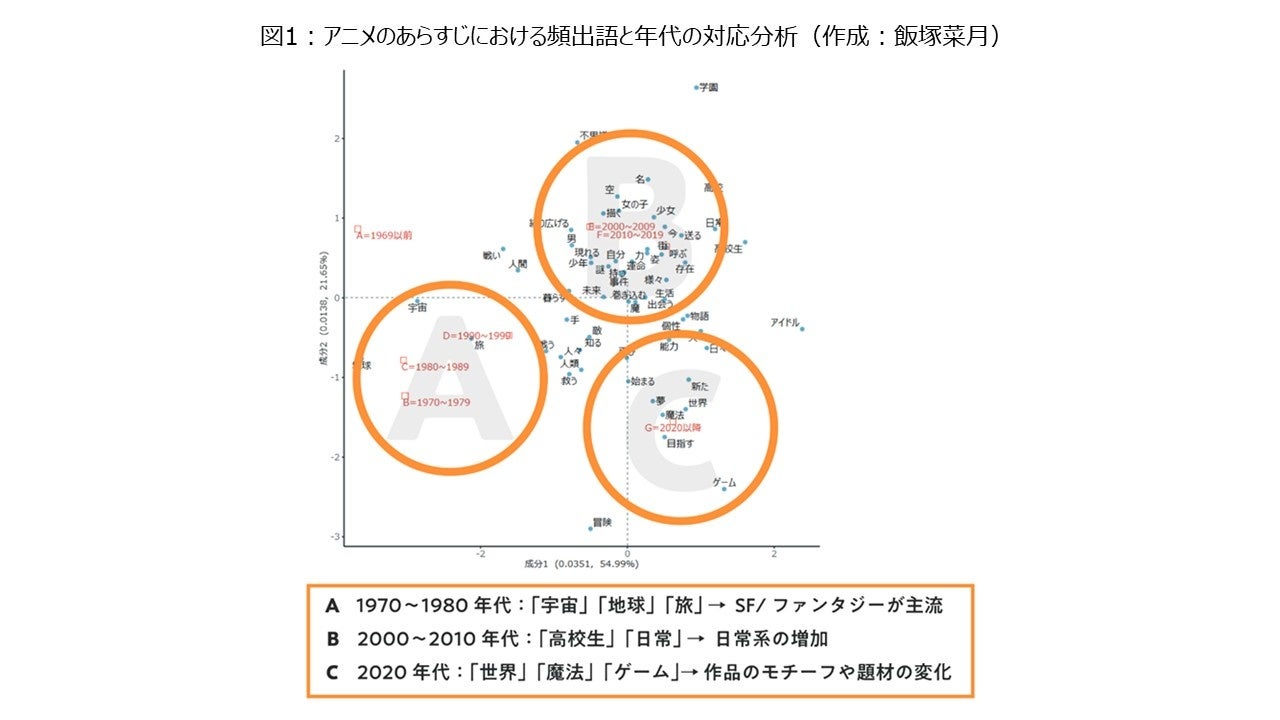 infrastructure using digital and web technologies and develop the associated tools and knowledge systems for the purpose of analyzing macro trends in animation. A research team led by Associate Professor Kazufumi Fukuda of Ritsumeikan University’s College of Film and New Media, in collaboration with Hakuhodo DY Music & Pictures, has conducted preliminary research, including text mining of anime synopses to examine evolving narrative trends (Figure 1) and macro-trend analysis of character eye and hair color (Figure 2).