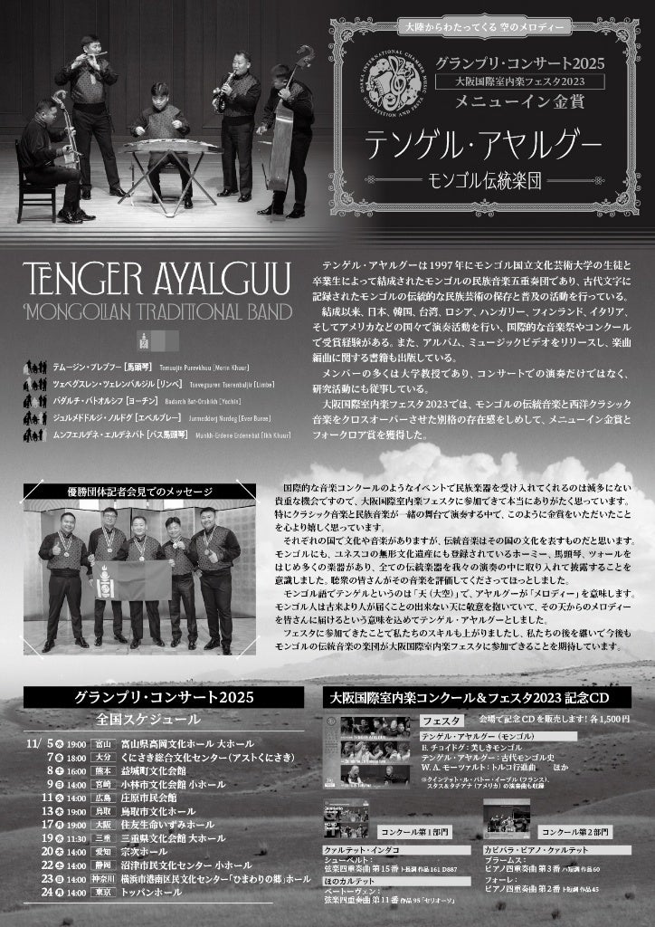 https://prcdn.freetls.fastly.net/release_image/151527/45/151527-45-60a7df742361afaaee675520fe7c22e3-724×1024.jpg The Mongolian traditional orchestra “Tenger Ayargoo” won the Gold Award at the Osaka International Chamber Music Festival 2023, demonstrating its exceptional presence through a crossover of Mongolian traditional music and Western classical music. The concert will feature Mongolian instruments and a talk about Mongolia, and there will also be an exhibition of Mongolian costumes and