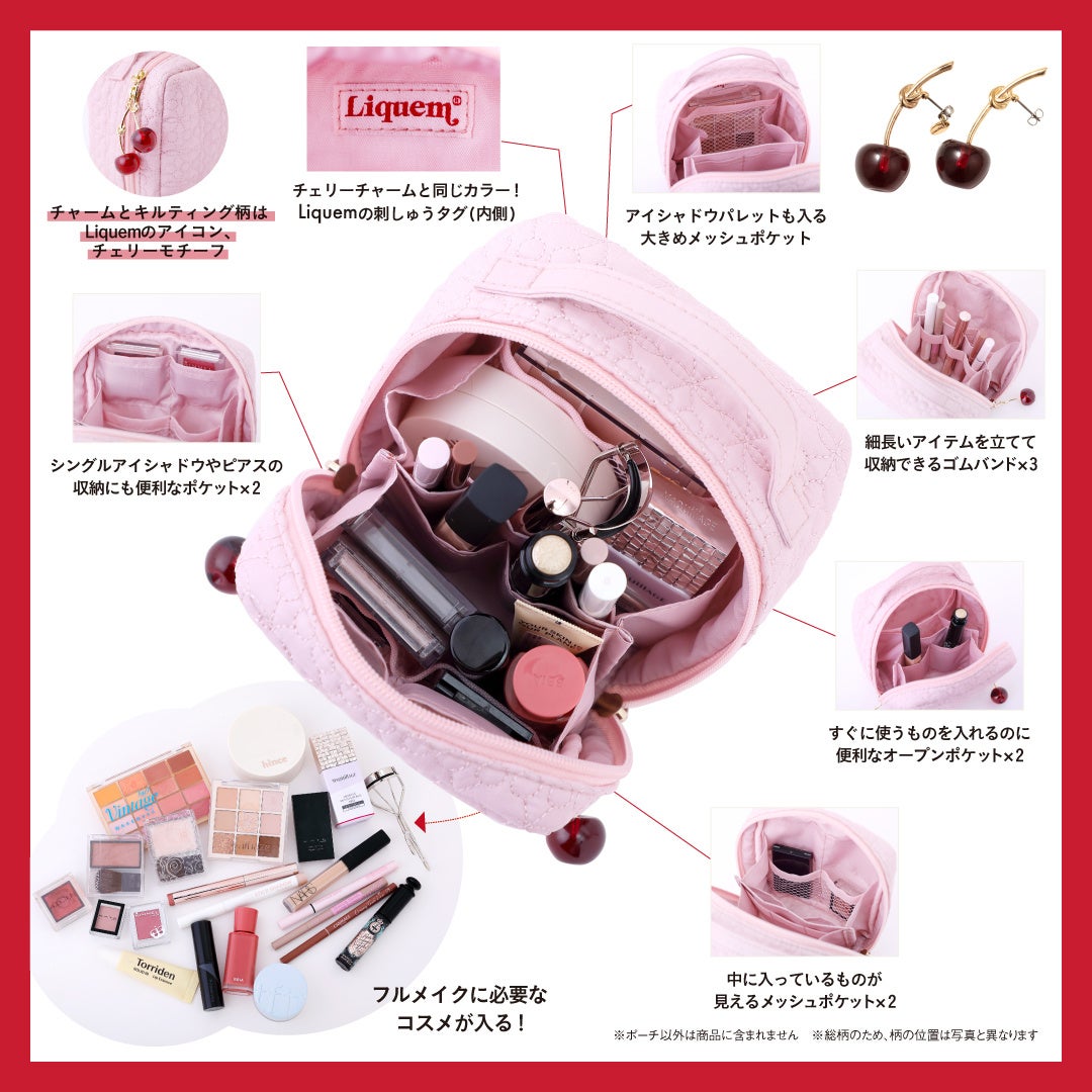 nationwide, online bookstores, Takarajimasha’s official online store, Takarajima Channel <Product Information> This pouch features Liquem’s iconic cherry motif. Cherry earrings and pierced earrings serve as charms. The quilting also features a cherry pattern, creating a design that makes abundant use of cherries. The pouch stands on its own and is just the right size to hold all the cosmetics needed for a full makeup look. It has a divider and opens wide, so you can see what’s inside at a glance. It’s easy to organize and can also be used as an accessory pouch or cosmetic pouch. Size (approx.): W12 x H12 x D8cm *Items other than the pouch are not included. *Since this is an all-over pattern, the pattern position may differ from the photo.