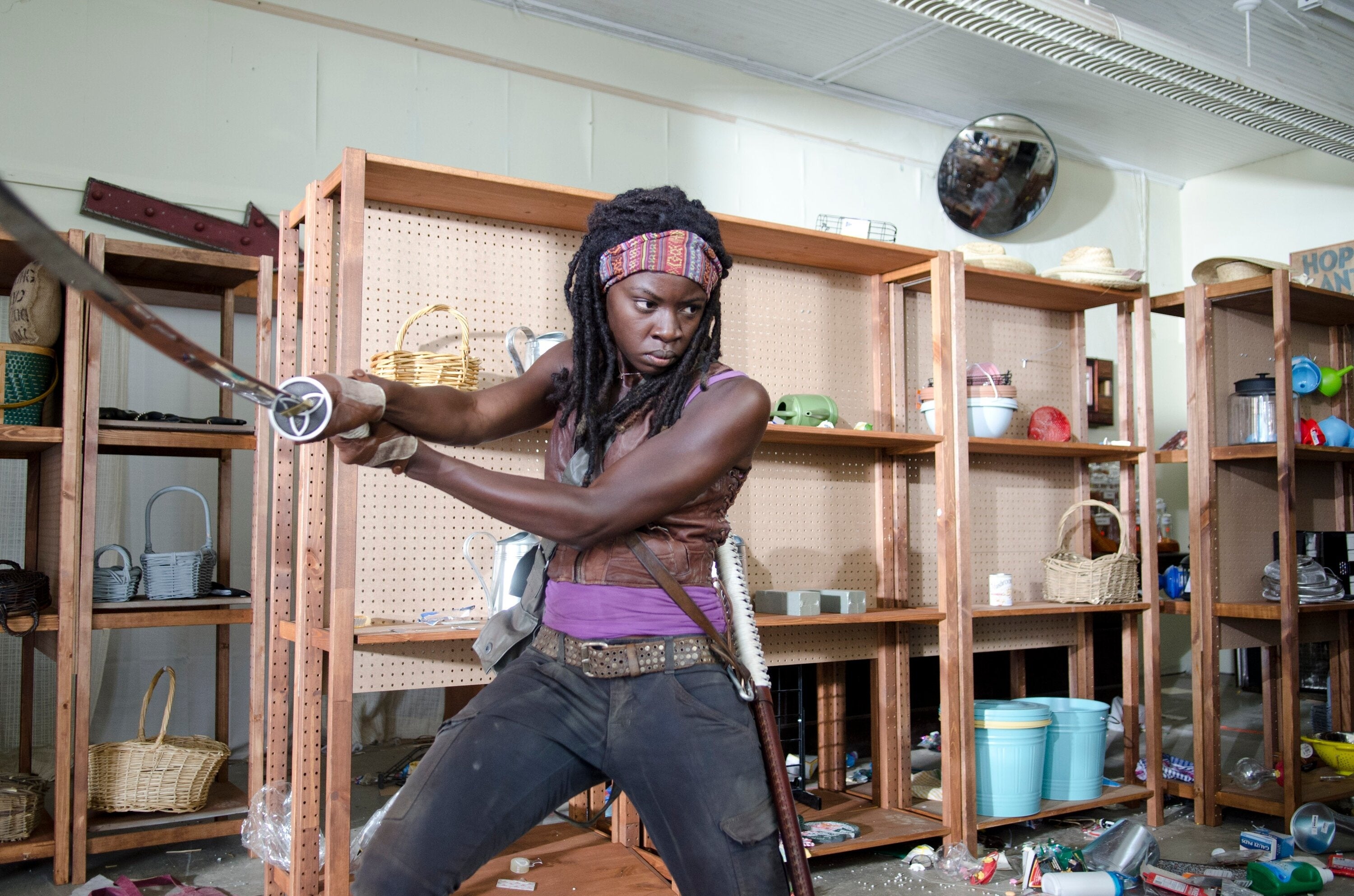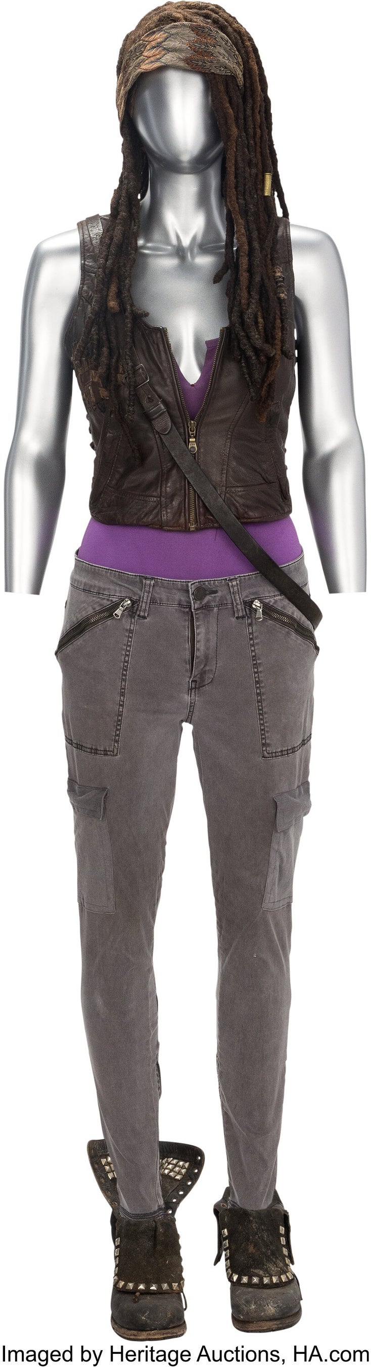 https://prcdn.freetls.fastly.net/release_image/135668/51/135668-51-2df9bfc0a431bef701f0e4994c5048ed-734×2700.jpg Imaged by Heritage Auctions, HA.com Michonne (Danai Gurira) from “The Walking Dead” (AMC 2010-2022, Season 3) costume and sword used in action scenes. Includes the original costume, including a hooded poncho, a wig made of various shades of brown hair with gold beads, a multicolored headband, and a high-density rubber action sword (approximately 109cm long) with an ivory and brown leather handle. These costumes were worn by Michonne (Danai Gurira) throughout Season 3 and first appeared in Episode 1, “Seed.” ◆Daryl Dixon’s (Norman Reedus) Custom Chopper Bike