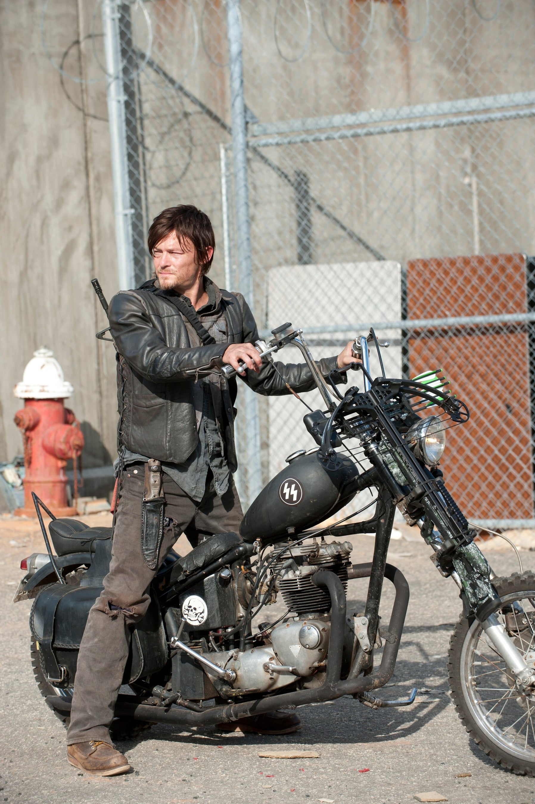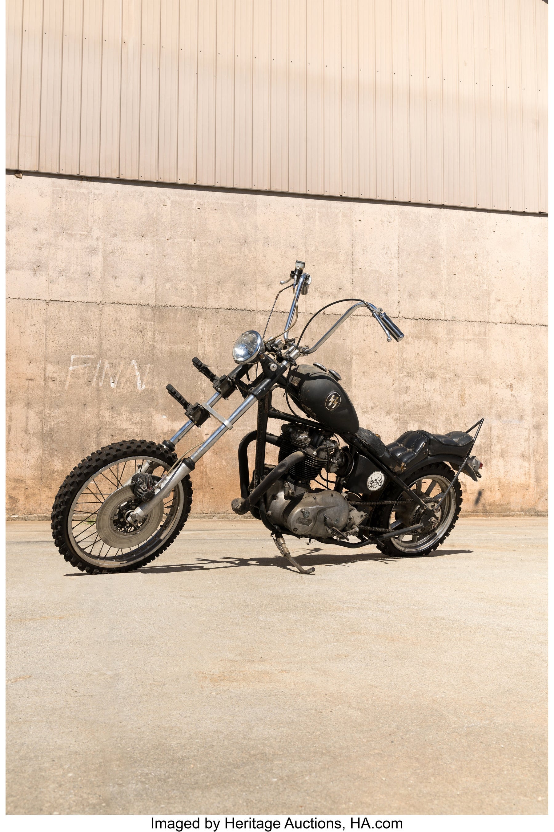https://prcdn.freetls.fastly.net/release_image/135668/51/135668-51-d4385e6a107f9b7bc069191b138b3611-1796×2700.jpg Imaged by Heritage Auctions, HA.com The Walking Dead (AMC This custom chopper bike, ridden by Daryl Dixon (Norman Reedus), appears in Seasons 1-4 (2010-2022). It’s a black Triumph Bonneville custom bike, featuring a Bonneville gas tank mounted on a 1960s Triumph frame, ape handlebars and risers, a leather seat, a hardtail rear suspension, and a weapons holder mounted on the right handlebar. The frame and both sides of the gas tank are adorned with distinctive