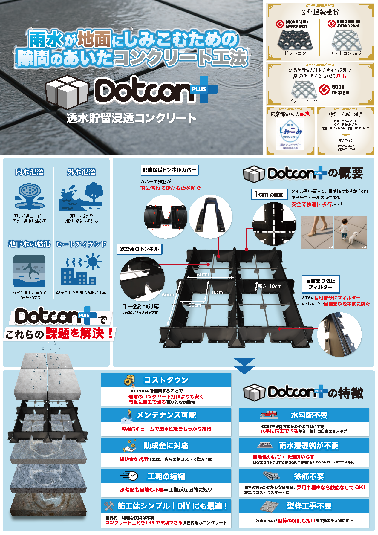 https://prcdn.freetls.fastly.net/release_image/130460/70/130460-70-7dbe2ab6156d9c77303abc57ca273da8-1265×1778.png ■ Exhibition Overview Exhibition Name: Good Design Award Winning Exhibition “GOOD DESIGN EXHIBITION 2025” Period: Saturday, November 1, 2025 to Wednesday, November 5, 2025 Time: 11:00-19:00 (*Doors open at 13:00 on November 1st, close at 18:00 on November 5th) Venue: Tokyo Midtown (Akasaka 9-chome, Minato-ku, Tokyo) Admission Fee: Free (no advance reservations required) At the Dotcon exhibition booth, you can experience the new urban landscapes brought about by permeable concrete through actual product displays and installation examples.
