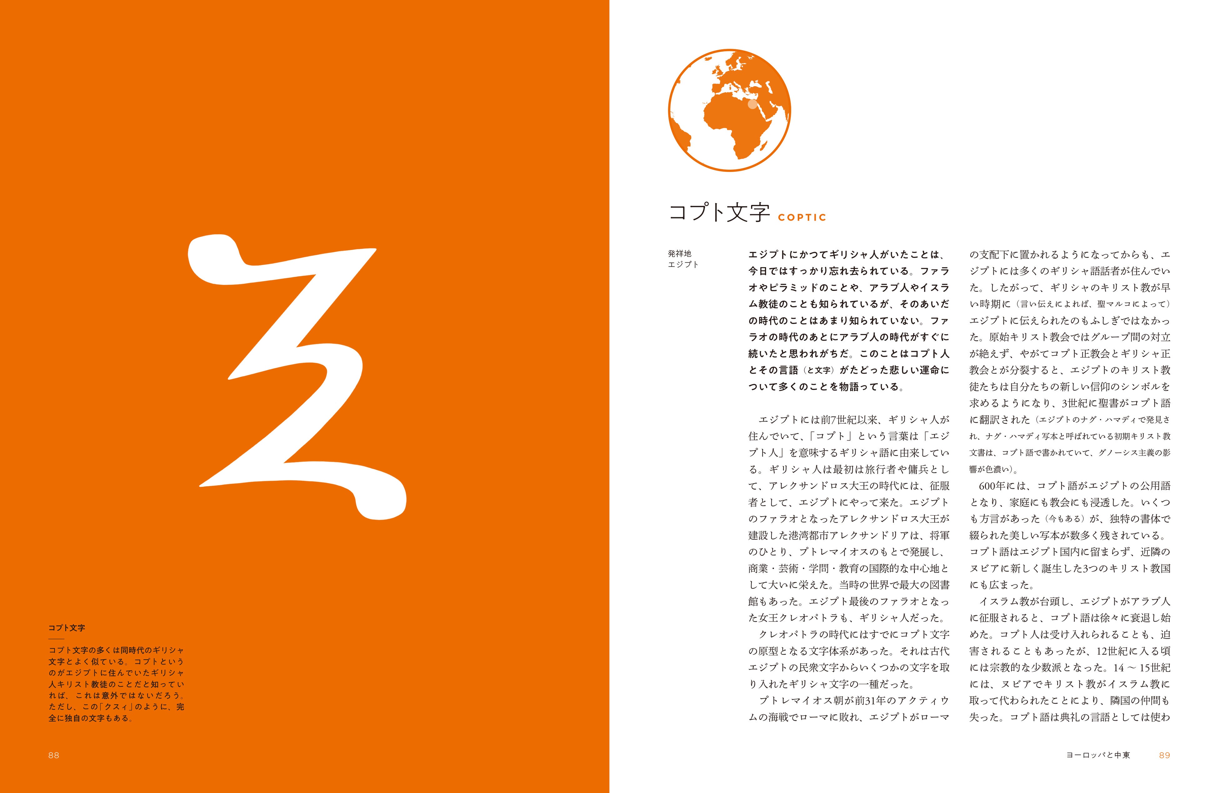 https://prcdn.freetls.fastly.net/release_image/12754/1084/12754-1084-7a991abf820be529ed06017051ff391e-3900×2538.jpg “Coptic script” (origin: Egypt) Copts are Greek Christians who lived in Egypt. It became the official language of Egypt in 600 AD, but with the rise of Islam, Copts and the Coptic language became a minority, and today there are only about 300 native speakers of Coptic in the world. (From P.88-91)