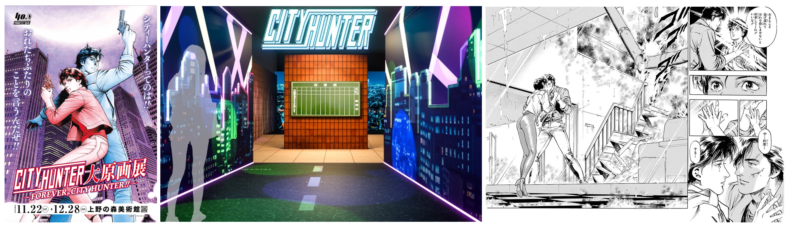 City Hunter Original Art Exhibition Tokyo Venue Executive Committee Press release: October 28, 2025 To Members of the Press Details of the “City Hunter Original Art Exhibition” are now revealed, including over 400 original hand-drawn illustrations and photo spots such as the legendary “Shinjuku Message Board” and “Cat’s Eye Cafe”! The full details of the interactive exhibit that immerses you in the world of City Hunter, including a photo spot that recreates a setting familiar to fans, have been revealed! -Venue-exclusive original merchandise featuring famous scenes and original artwork will also be on sale-