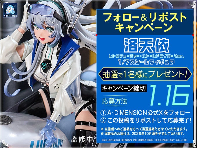 https://prcdn.freetls.fastly.net/release_image/145011/19/145011-19-9ef93adb29355a583c4649d4a16ba088-1200×1200.jpg Serial number engraved! Limited-time bonus: Includes a special acrylic key chain featuring a Tenzin design <Product Overview> [Product Name] Vsinger Luo Tianyi Retro-Future Storm Driver Ver. 1/7 Scale Figure [Pre-order Location] E-commerce site “A・DIMENSION” https://a-dim.com/ Also available at hobby shops and hobby-related e-commerce stores [Pre-order Period] Monday, October 28, 2025, 10:00 AM Until 11:59 PM, Friday, January 16, 2026 [Release Date] October 2026 (planned) [Price] ¥27,000 (excluding tax) / ¥29,700 (including tax) [Size] Total height: Approximately 230mm [Distributor] A-DIMENSION Co., Ltd. [Copyright] (C)SHANGHAI HENIAN INFORMATION TECHNOLOGY CO.,LTD <About the X (formerly Twitter) Follow & Repost Campaign>