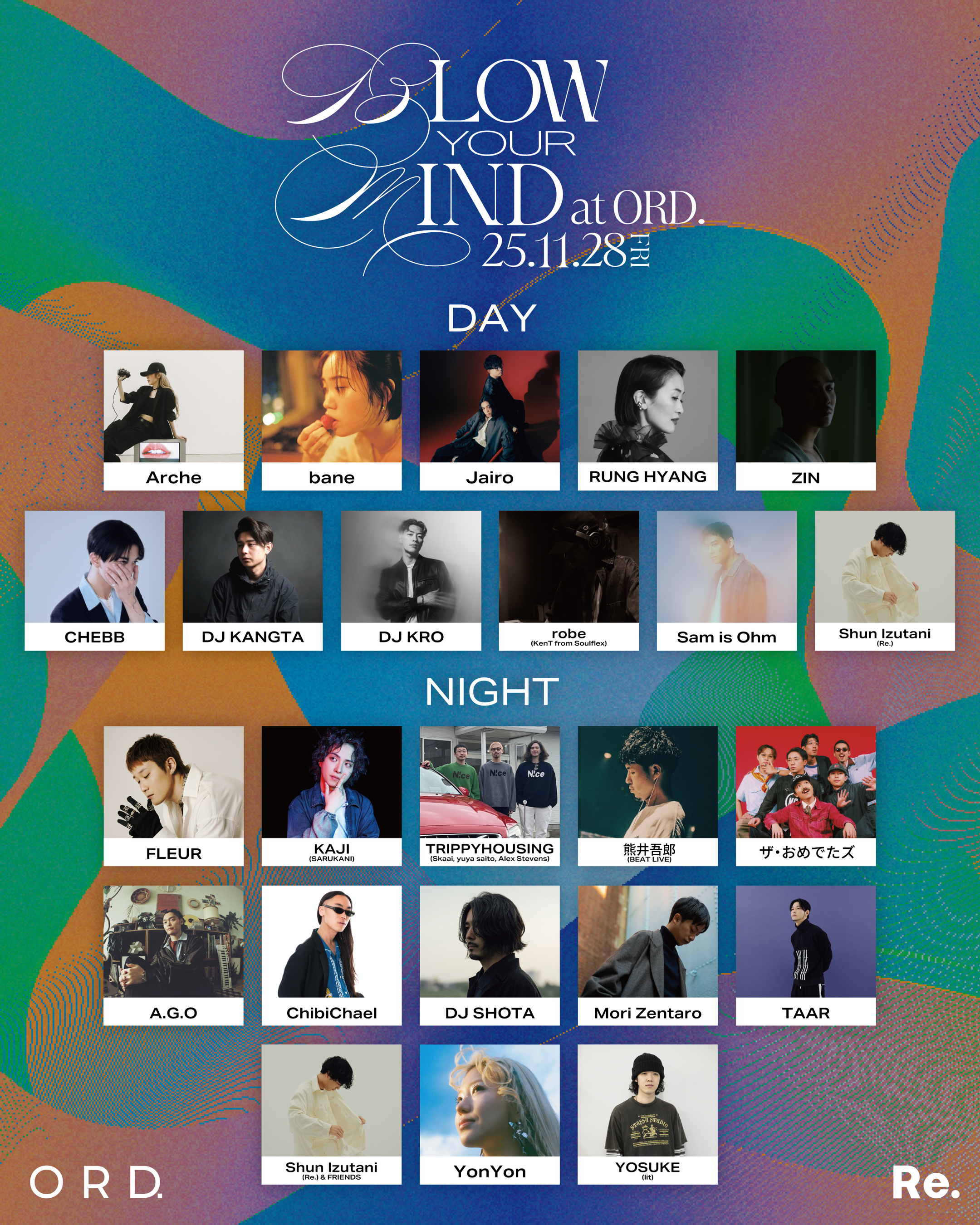 https://prcdn.freetls.fastly.net/release_image/103622/91/103622-91-4ade9ab4490e2c0febcd0ef592bd3c71-2160×2700.png On Friday, November 28th, the highly anticipated event “BLOW YOUR MIND,” hosted by multi-producer collective Re., will be held at their new Daikanyama location, ORD. Re. has made its presence felt through cross-scene events, such as “ENTRANCE” at Time Out Cafe & KATA and “MODERN DISCO” at SOUND MUSEUM VISION. This latest event, the culmination of their efforts, will be split into two parts: DAY and NIGHT, and will be their largest to date. The live performances will feature ZIN, who is about to embark on a Billboard tour; RUNG HYANG, leader of Runhyang Seminar; world beatbox champion Jairo; and the Omedetaz, a rap group from Toyama. Additionally, Goro Kumai will perform a beat live show, and a diverse range of genre-transcending artists will appear, including bane, FLEUR, and TRIPPYHOUSING. DJ SHOTA, Japan’s No. 1 DMC, will make his first appearance as DJ. Popular DJs like YonYon and DJ KRO (Chilly Source) will also be making a return appearance, alongside top producers like Sam is Ohm, A.G.O, TAAR, and Mori Zentaro. VJ watakemi (tsuchifumazu) will be providing VJ and food from TRIP Tacos will be providing food, making this an experiential event that incorporates sound, visuals, and taste. This night will bring together some of the most representative artists in the scene. It will be a rare opportunity to experience the “original festival experience” that Re. has been pursuing at Daikanyama ORD. Performance name Re. presents “BLOW YOUR MIND” at ORD. Performance date and time Friday, November 28, 2025 DAY: OPEN 18:00 START 18:45 CLOSE 23:00 NIGHT: OPEN 22:30 START 23:15 CLOSE 5:00 Venue Daikanyama ORD. 2F, The House Building, 1-34-17 Ebisu Nishi, Shibuya-ku, Tokyo Ticket Prices ONE DAY (All-day ticket): Limited-quantity advance tickets ¥6,500 Advance ¥7,500 Same-day ¥8,500 DAY: Advance ¥4,500 Same-day ¥5,000 NIGHT: Advance ¥3,000 Same-day ¥3,500 (* 1 drink fee not included) Purchase tickets