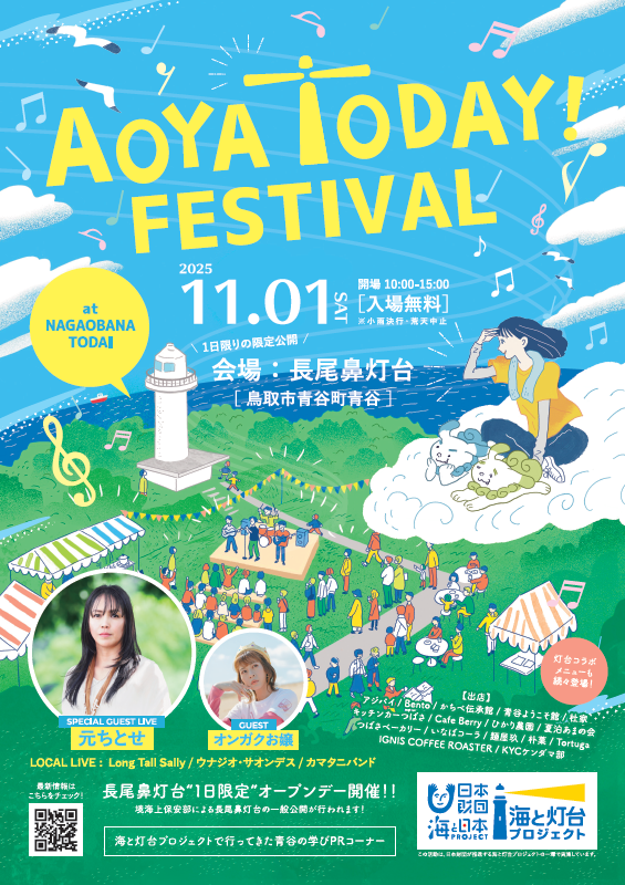 inaccessible under the management of the Japan Coast Guard, but on the day of the event, the lighthouse will be open to the public for a limited time and used for a music festival. The special guest on stage will be none other than Moto Chitose! In addition to other local music artists, MC Maya Nakao (Nihonkai TV announcer) from the popular local music program “Ongaku Ojo” will also be participating! In addition, as a limited-time event, with the support of the Japan Coast Guard, we will be opening the Nagaohana Lighthouse to the public for a limited time! An observation area with a panoramic view of Tottori Prefecture from one end to the other will also be open to the public for a limited time. In addition, the gourmet booth will be introducing a variety of “lighthouse collaboration menus”! There will also be panels introducing the lighthouse utilization projects that have been carried out so far! Come and enjoy the first-ever music festival at Nagaohana Lighthouse! Event name AOYA TODAY FESTIVAL Date & Time Saturday, November 1, 2025, 10:00 AM – 3:00 PM; Shuttle bus service 9:00 AM – 3:00 PM Venue Access *The only way to access the venue is by shuttle bus from Aoya Town Rural Square. [By car] Parking at Aoya Rural Square (1351 Aoya, Aoya Town, Tottori City) and taking the shuttle bus to the venue. Program Stage Program 10:00 OPEN DJ Yuragu 10:30 DJ TA2Soul 11:00 Unajiosaondesu 11:30 DJ Yuragu 12:00 Kamatani Band 12:30 DJ TA2Soul 13:00 Hajime Chitose (Special Guest) 13:30 Fun! Lighthouse Quiz! 14:00 Long Tall Sally14:30 DJ TA2Soul 15:00 CLOSE Other events include food and entertainment booths Lighthouse open for one day only & observation area open Lighthouse Project retrospective panel exhibition FES merchandise sales (festival T-shirts, festival towels, festival tote bags), and more Enjoy a variety of events. Organization name: Tottori City Aoya District Promotion Project Executive Committee URL: https://www.aoyatoday.com/ Activities: Rediscovering the value of lighthouses and revitalizing the local area through the utilization of Nagaohana Lighthouse in Aoya, Tottori City.