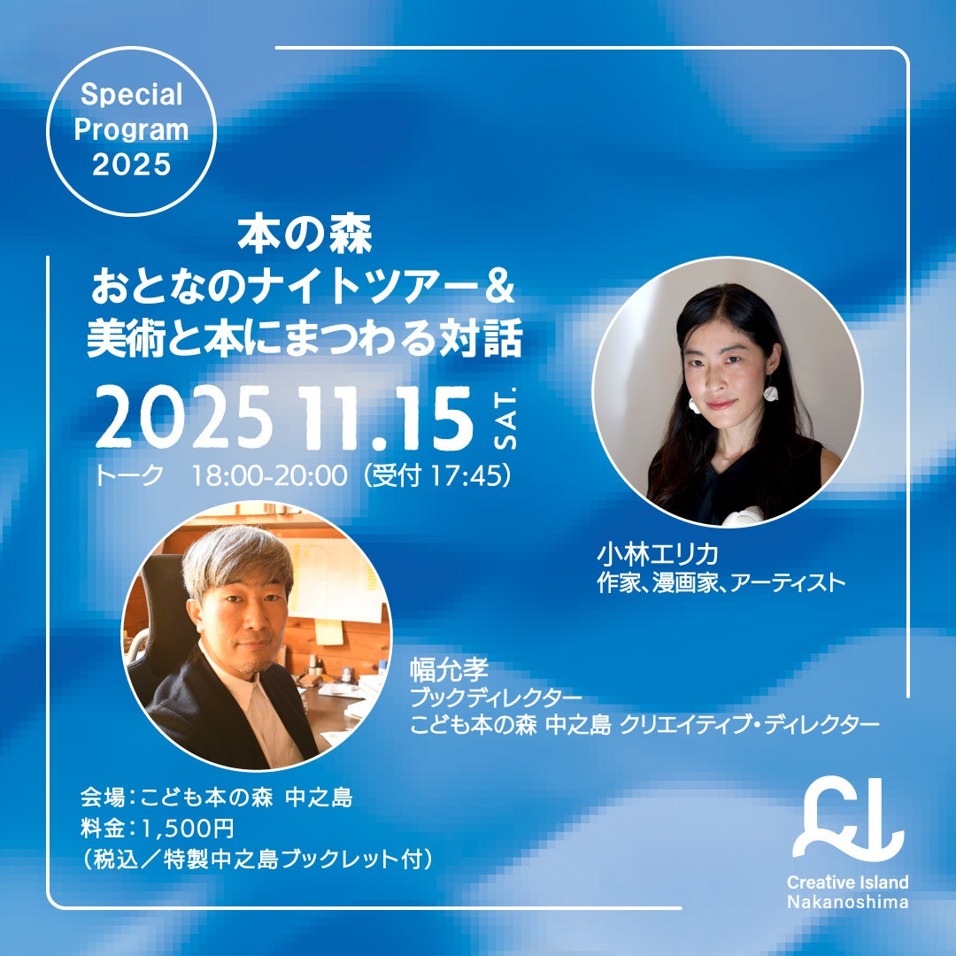 中之島が所蔵する草間氏の絵本やgrafと草間氏のコラボレーション家具を紹介しつつ、アーティストと本と表現の世界について、ご自身も作品制作と執筆活動をされる小林エリカ氏をゲストに迎え、本の森クリエイティブ・ディレクターの幅允孝氏と対話を繰り広げます。 日時:11月15日(土)18:00-20:00(17:45受付開始) 会場:こども本の森 中之島 定員:60名(先着順・要事前申込) 料金:1,500円(税込、特製中之島ブックレット付) 登壇者:幅允孝(ブックディレクター、こども本の森 中之島