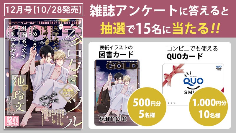 https://prcdn.freetls.fastly.net/release_image/22435/938/22435-938-ae9cd49c28555a614d02aff7acc09d88-800×450.jpg We’re currently running a Be-Boy Gold Readers Giveaway! Answer the survey and win one of the following fantastic prizes! We look forward to receiving your heartfelt messages for each author. 1. Cover illustration book card worth 500 yen (5 winners) 2. QUO card worth 1,000 yen (10 winners) <Application Rules> Please apply by selecting one of prizes 1 or 2 using the survey postcard at the end of the book or the online survey. Please note that applications submitted by any other method will be invalid.