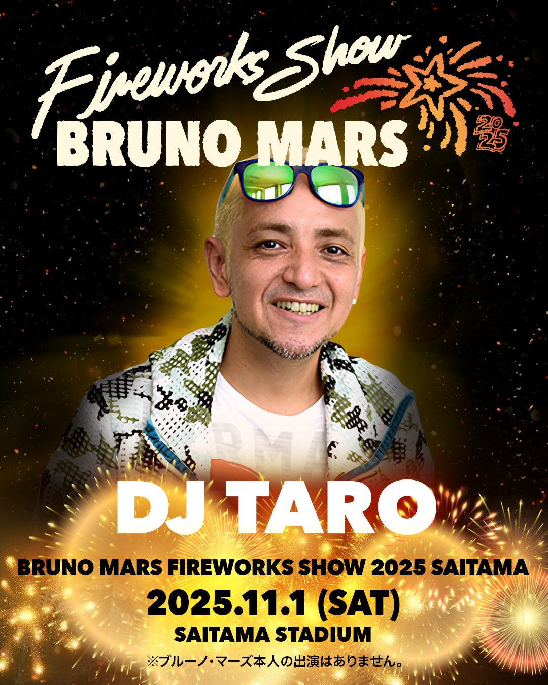 merchandise, a big gacha machine, and a photo booth, and fans’ expectations are already high. The countdown to the final week has finally begun. Don’t miss this world-first event featuring Bruno Mars collaborating with fireworks! Bruno Mars Fireworks Show 2025 Official HP:https://brunomars-fireworks.jp (Bruno Mars will not be appearing at this event.) [Saitama Performance: Timetable] Bruno Mars Fireworks Show 2025 Saitama 2025.11.01 (Sat) Saitama Stadium 2◯◯2 15:30 Doors Open 15:30-16:15 YonYon (DJ Play) 16:15-17:00 DJ KOMORI (DJ Play) 17:00-17:45 DJ TARO (DJ Play) 17:45-18:30 DJ KAORI (DJ Play) 18:30-19:40 Bruno Mars Fireworks Show 2025 【DJs】 *In order of timetable