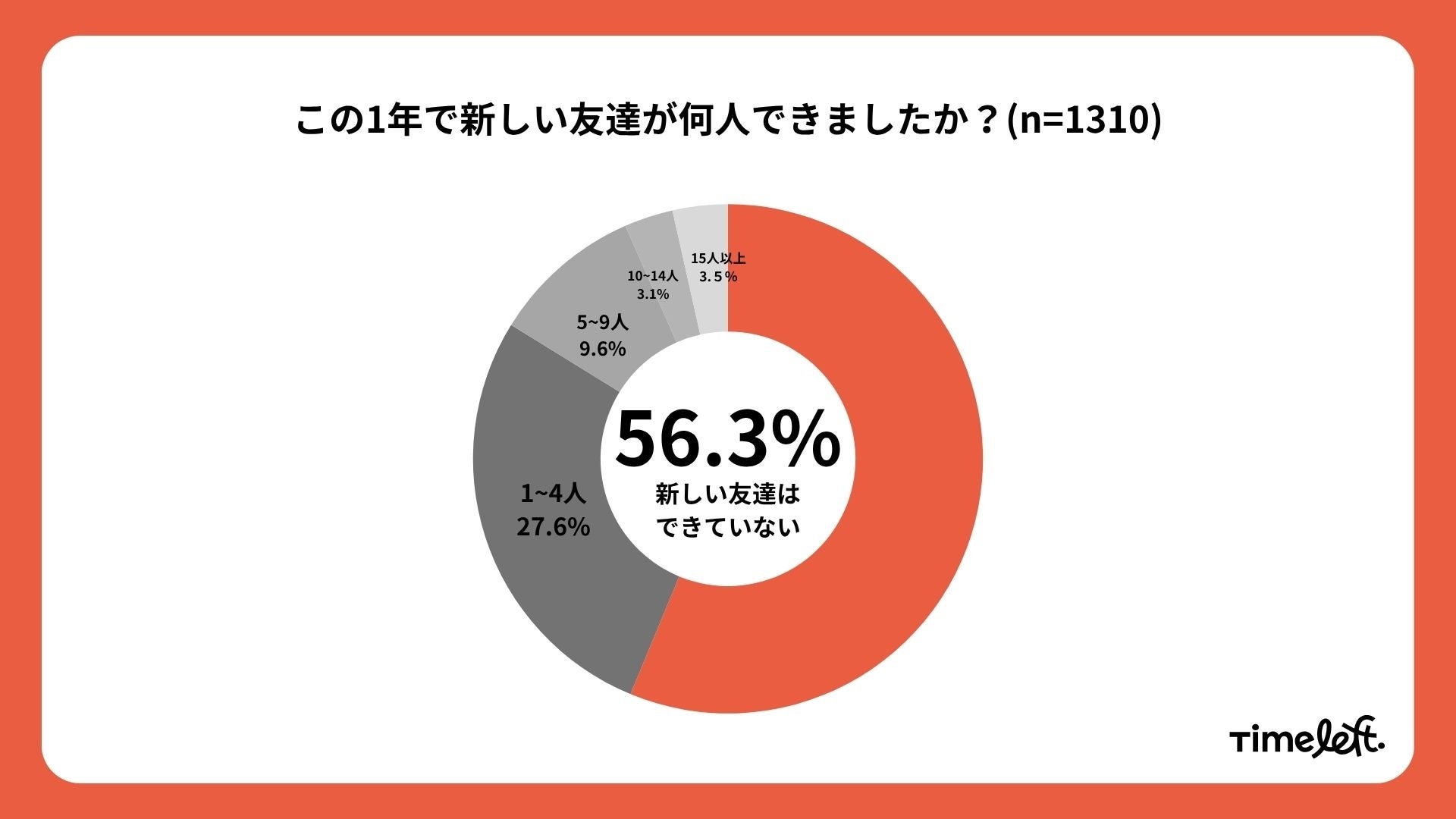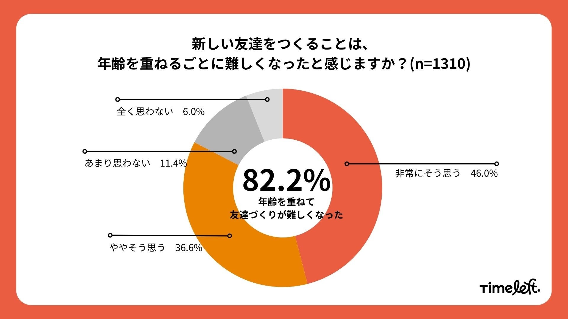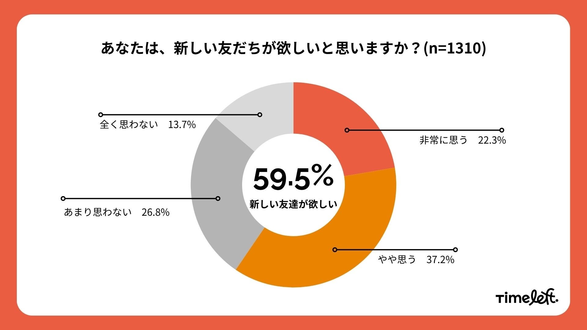 URL: https://prcdn.freetls.fastly.net/release_image/164135/4/164135-4-b108da77a0eed9dfdbff802ad92a4714-3900×2600.jpg Timeleft: A service that creates serendipitous encounters Loneliness has become a serious social issue in Japan in recent years, and the “Act on Promotion of Measures to Combat Loneliness and Isolation” came into effect in April 2024. Against this backdrop, an increasing number of adults are experiencing challenges with their friendships and connections with others. Timeleft conducted this survey to clarify the state of human connections in modern society and to gain insights for alleviating loneliness and building better relationships. The results showed that while approximately 60% (59.5%) of respondents said they wanted to make new friends, more than half said they had not made any new friends in the past year.Furthermore, over 80% of respondents felt that it was more difficult to make new connections as they got older, suggesting a growing risk of social isolation. Survey results summary • More than half of working adults answered that they “want to make new friends.” This tendency is particularly high among younger generations, with 77% of those in their 20s. • A new trend?! There is a growing trend of interest in “making friends,” especially among young people. 53% are positive • However, the reality is that approximately 60% of people have not made any new friends in the past year! • 18.2% of respondents answered that they “have not made any new friends since entering the workforce,” and 22.8% of working adults answered that they “have no close friends.” Survey Results Details ◆60% of respondents answered that they “want to make new friends.” This is especially noticeable among people in their 20s and 30s. In response to the question, “Do you want to make new friends?”, 59.5% of respondents answered “I strongly agree” or “I somewhat agree.” This trend is particularly pronounced among younger generations, with 77% of those in their 20s and 62.3% of those in their 30s responding “strongly agree” or “somewhat agree.” While less than half of those in their 40s and 50s answered the same, younger generations have a stronger tendency to seek new encounters, revealing that attitudes toward “making new connections” vary greatly depending on life stage.