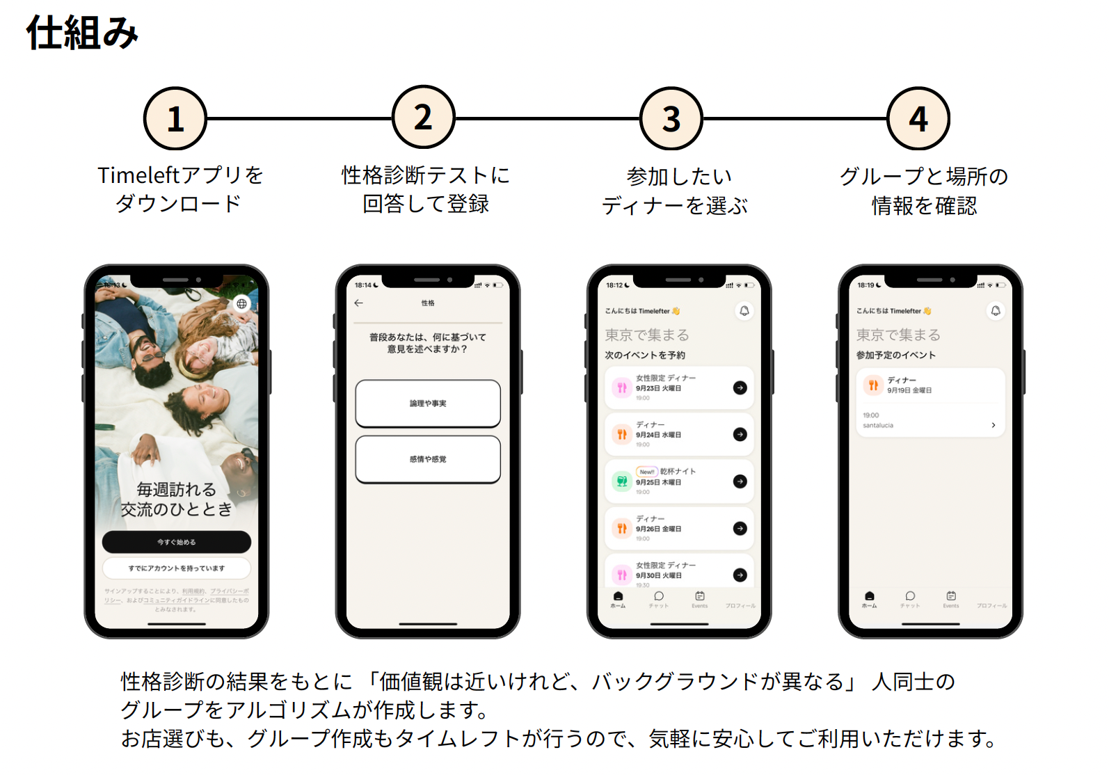 “Timeleft” Dinner Experience Shines a Light on a “Solitary Society” Even though we long for new friends, it’s actually difficult to find the opportunity. This gap felt by many working adults is thought to be due to a decline in the “randomness of encounters.” This survey also revealed that while many people desire “deep connections,” they first seek “natural encounters” as a gateway to those connections. Timeleft is a social dining service that creates new connections through dinner with strangers. Amid these challenges, it aims to bring back those “weak ties”—those fortuitous connections—to society and create opportunities for stronger connections. With “Timeleft,” an algorithm matches 5-6 people with similar values but different backgrounds, and they meet at a designated restaurant. Timeleft handles the restaurant selection and group placements. All users need to do to participate is choose their desired time and head to the designated restaurant. You’ll have to wait until you get there to find out what kind of people show up. No prior interaction or preparation is required, allowing you to meet new people as if by chance. Dinners are held every Wednesday around the world, allowing people who have never met before to share the same time across time zones and experience a global sense of unity. We also offer a variety of other interaction styles to meet user needs, such as “Ladies-Only Dinner on Tuesdays” and “Thursday Toast Night.” Just one year after entering the Japanese market in 2024, the number of registered users has exceeded 30,000, and people of all ages, from their 20s to their 60s, are enjoying dinner with strangers.
