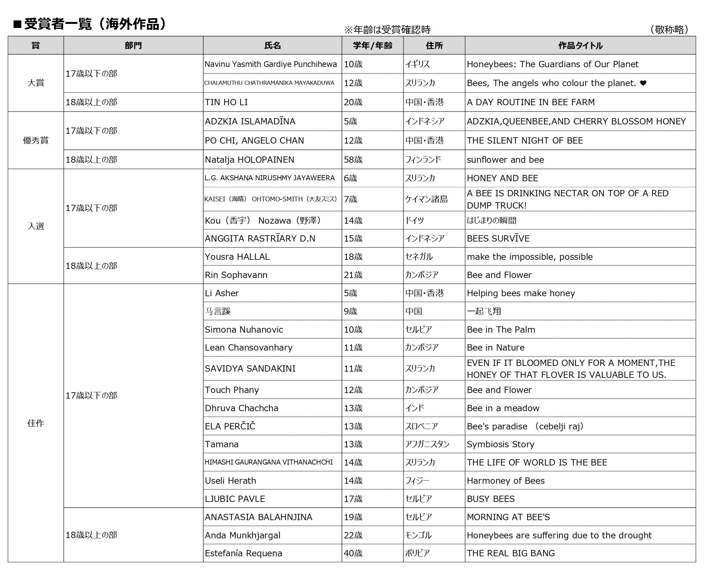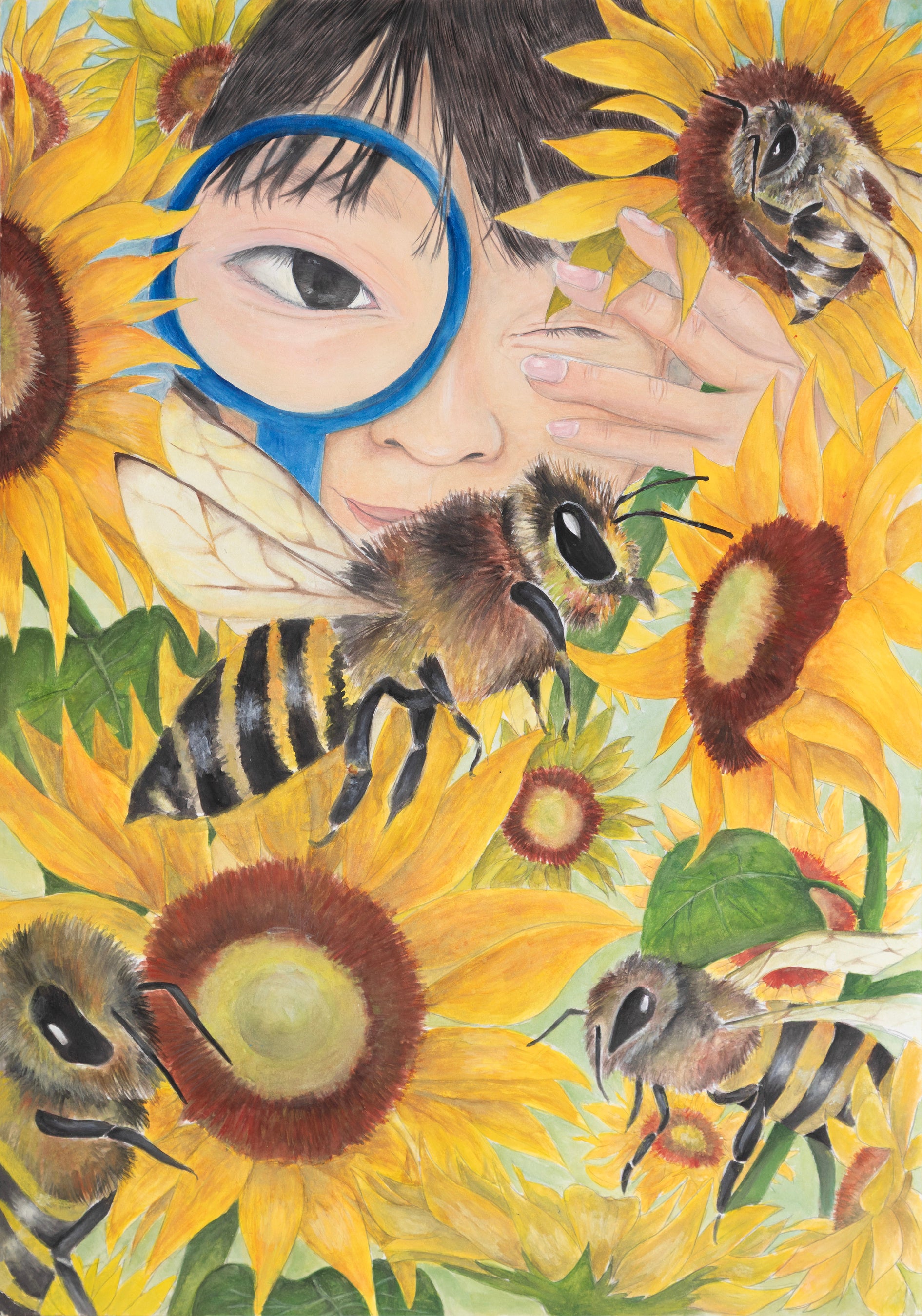 URL: https://prcdn.freetls.fastly.net/release_image/30748/293/30748-293-bb19a042d0b83cb6ede4ef3d8a399bf8-3900×2806.jpg ◇General Division: Kokoro Okawa (Saitama Prefecture, 20 years old) “Let’s bring color to the world” List of award-winning works (3 overseas categories) ◇Under 17 Division: Navinu Yasmith Gardiye Punchihewa (UK, 10 years old) “Honeybees: The Guardians of Our Planet”