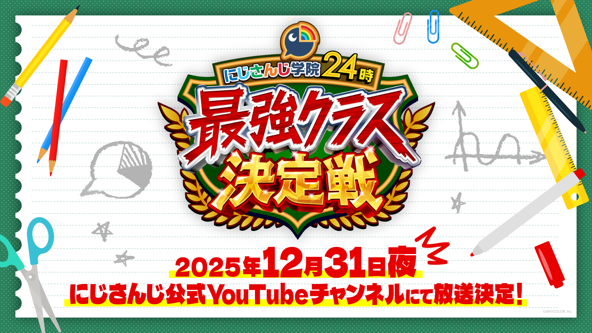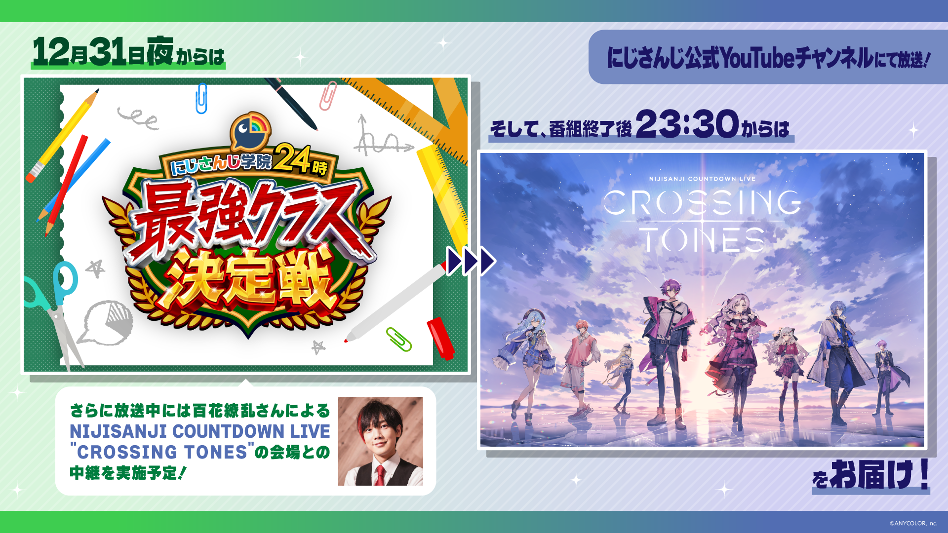 https://prcdn.freetls.fastly.net/release_image/30865/1332/30865-1332-96aa31be0f779d7cf3ea8955575d68a0-1920×1080.png As part of this year’s end-of-year project, 28 live streamers from our virtual live streamer groups, “Nijisanji” and “NIJISANJI EN,” will gather at a school deep in the mountains to compete in the “24-Hour Real School Battle! Nijisanji Strongest Class Showdown!!,” which will be broadcast on the official Nijisanji YouTube channel. They will take on various challenges set out for the entire school, aiming to become “Nijisanji Academy’s Strongest Class.” Enjoy the finale of 2025 with the live streamers. 【Special Program Overview】 ■ List of Performers (in alphabetical order) Iha Rai / Usami Rito / Uzuki Kou / Umi Yotsuba / Kagami Hayato / Kaburagi Roko / Kitami Yusei / Kyoran Meroko / Kenmochi Touya / Saeki Ittetsu / Sasaki Saki / Shiina Yuika / Shishido Akari / Takamiya Rion / Tateden Totsu / Tsukino Mito / Nagao Kei / Hanabatake Chaika / Higuchi Kaede / Fuura Souto / Flynn E. Rustario / Hoshikawa Sara / Maimoto Keisuke / Milan Kestrel / Murakumo Kagetsu / Lize Helesta / Rain Patterson / Leos Vincent and more ■Streaming date and time: Wednesday, December 31, 2025 (evening) ■Special website: https://www.nijisanji.jp/events/2025-2026/ ■Streaming site: Nijisanji official YouTube channel https://www.youtube.com/c/nijisanji *The entire program will be available for free streaming. Program details and streaming times will be announced at a later date. New Year’s Eve live show with AR performance “NIJISANJI COUNTDOWN LIVE “CROSSING TONES”” The event is confirmed!