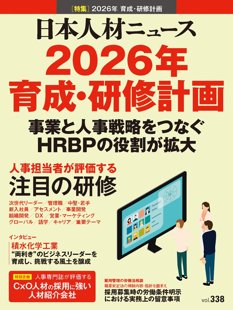 https://prcdn.freetls.fastly.net/release_image/118301/44/118301-44-96a28f50916c2615ec6c55acbf8382e4-1200×800.jpg Table of Contents of “Japan Human Resources News Vol. 338” 【Special Feature】2026 Development and Training Plan The expanding role of HRBPs in connecting business and HR strategy Norifumi Mizogami, Editorial Committee Member and Journalist, Japan Human Resources News Featured training highly rated by HR professionals Next-generation leaders / Managers / Mid-career and junior employees / New employees / Assessment / Business development Organizational development / Digital transformation / Sales and marketing / Global / Language / Career / Important themes 【Company Interviews】 Developing ambidextrous business leaders and fostering a challenging culture Tatsuaki Baba, Recruitment and Promotion Team Leader, Human Resources Management Group, Human Resources Department, Sekisui Chemical Co., Ltd. 【Recruitment agency specializing in recruiting CxO talent】 Axiom / Antelope Career Consulting / Career Incubation / KIRINZI / Concord Executive Group / SearchExe / Tiglon Partners / NEWOLD AGENT / Bond Associates 【Recruiting Trends Report】 ~Recruitment consultant explains human resources market trends and key points for successful recruitment [Retail & Distribution] Persol Career, Takafumi Sakurai,