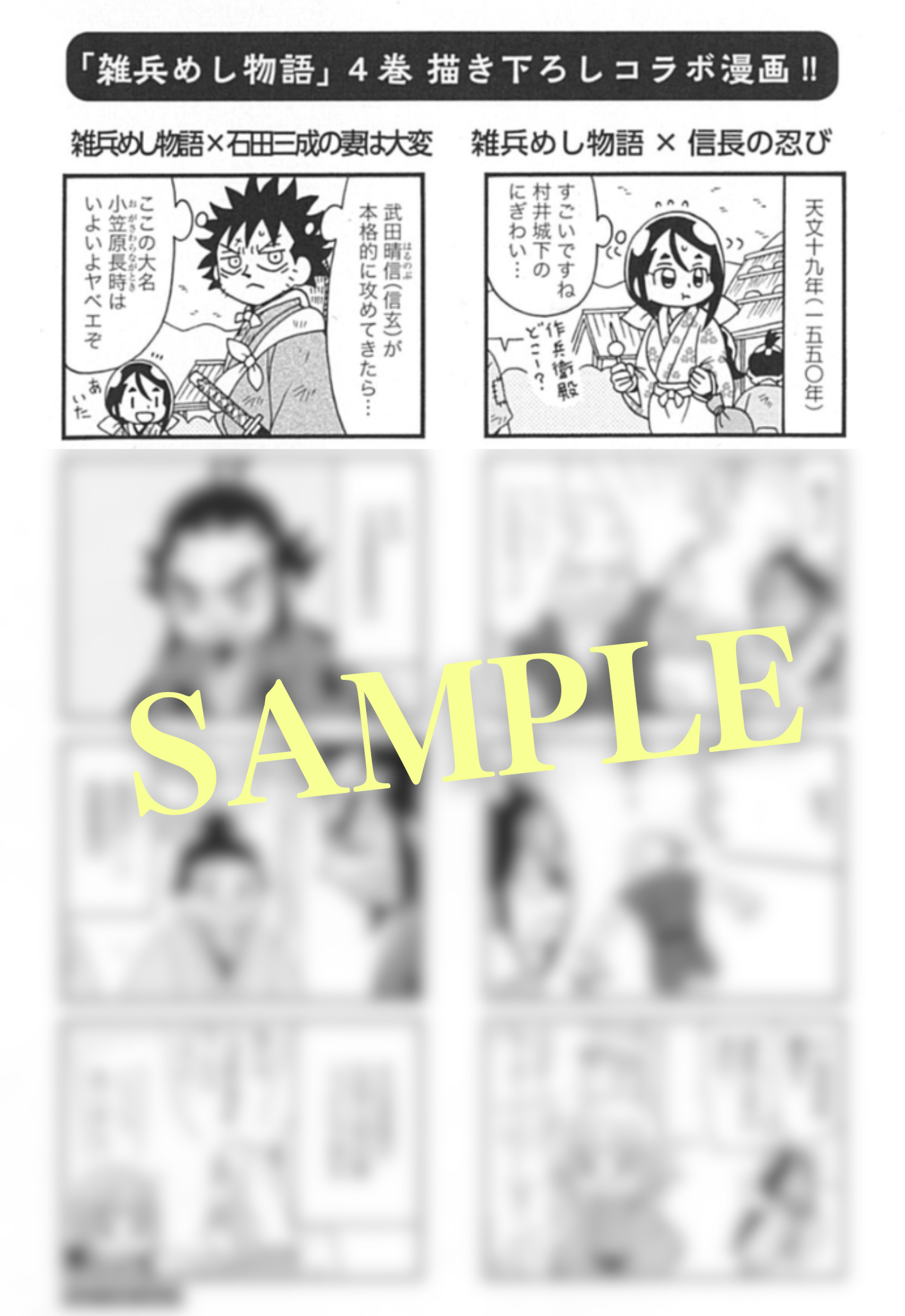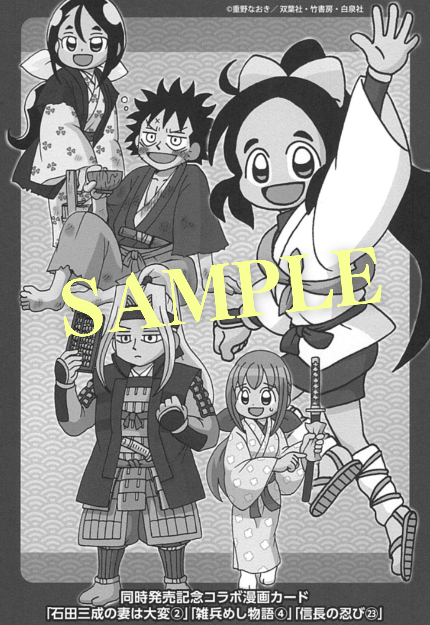 ・First-Edition Bonus To commemorate the simultaneous release of Naoki Shigeno’s “Nobunaga’s Shinobi” Volume 23 (published by Hakusensha) and “Ishida Mitsunari’s Wife is Tough” Volume 2 (published by Futabasha), the print editions of each new volume will include a specially drawn collaboration manga card as a first-edition bonus! One side features a collaborative illustration common to all three works, while the other side features a collaborative manga with different content for each work! All of these are special manga cards drawn by Naoki Shigeno specifically for this occasion.