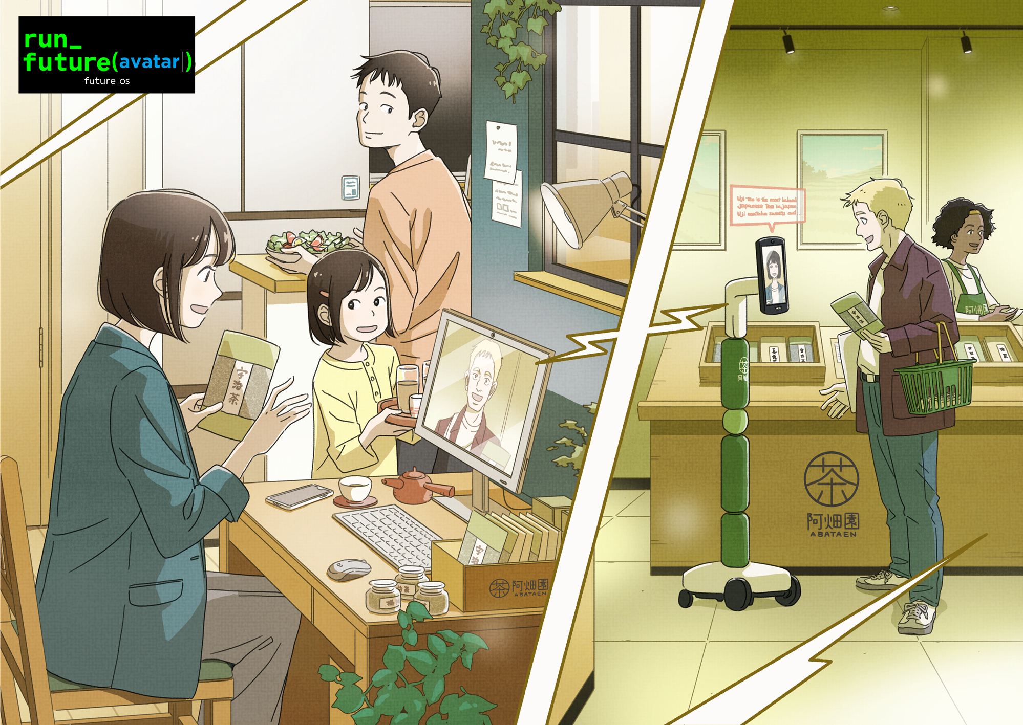 PDF data: https://www.campuscreate.com/next5g/wp-content/uploads/2025/10/rgb_run_futureavatar_min.pdf (Title) run_future (avatar) run_future is a project that visualizes the ideas of companies, research, and technology based on the concept of syntax that activates the future. As the name, which uses functional notation in programming languages, suggests, the project aims not only to visualize a vision but also to express a view of the future unfolding through technology. For the second installment, we created the artwork “run_future (avatar),” based on the vision of avatarin Inc., an AI and robotics startup developing the communication AI robot newme. This artwork depicts a scene from a Japanese home connecting with a Japanese tea specialty store overseas, using the communication AI robot newme to provide customer service. This work depicts a future where technology has made “working with someone far away” a part of everyday life, along with the warmth of the home. The everyday scenes at home and the expressions of conversations during customer service are imbued with thoughts of a future where digital and human activities blend naturally together. Mizusu’s soft brushstrokes depict a new lifestyle that lies between “work” and “living.” Mizusu