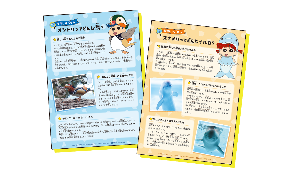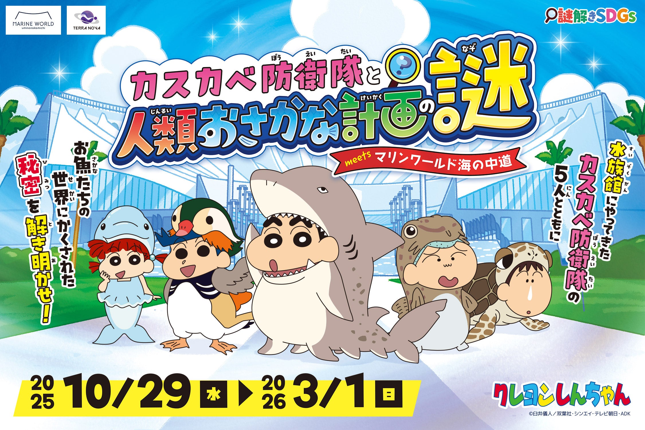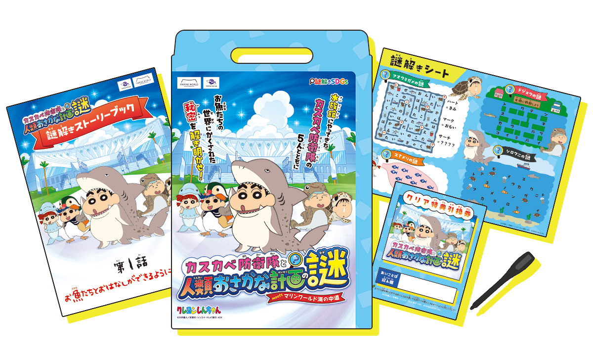 https://prcdn.freetls.fastly.net/release_image/69223/26/69223-26-74a3d065bf3edefab3af1502a884bc9b-3900×1845.png Original designs of the Kasukabe Defense Force created specifically for “Marine World Uminonakamichi” and new characters original to this work This event can be enjoyed by children and adults alike, but the puzzle-solving questions are serious! Using clue panels installed throughout the venue, participants will use their knowledge of the ecology and characteristics of aquatic creatures to solve the mystery. In the second half of the story, participants will consider the various anomalies and problems occurring in the aquatic world, including the oceans and rivers, as they take on the final mission. Through solving the mystery, participants can learn about aquatic creatures and environmental issues in a fun and natural way. Because the aquarium is also an educational institution, we aimed to create a full-fledged mystery-solving event that allows participants to both play and learn. At the same time, the usual “Shin-chan-like” interactions are still present. Enjoy the hilarious story unfolding with the unique members of the Kasukabe Defense Force. Event Period Wednesday, October 29, 2025 – Sunday, March 1, 2026 Location Marine World Uminonakamichi Address: 18-28 Nishitozaki, Higashi-ku, Fukuoka City, Fukuoka Prefecture, 811-0321 TEL: 092-603-0400 Official website:https://marine-world.jp/ Puzzle Participation Fee 800 yen (tax included) *This is the sales price for the puzzle kit. Aquarium admission fees apply separately. ★Click here for a discounted advance ticket set that includes admission and a puzzle-solving kit