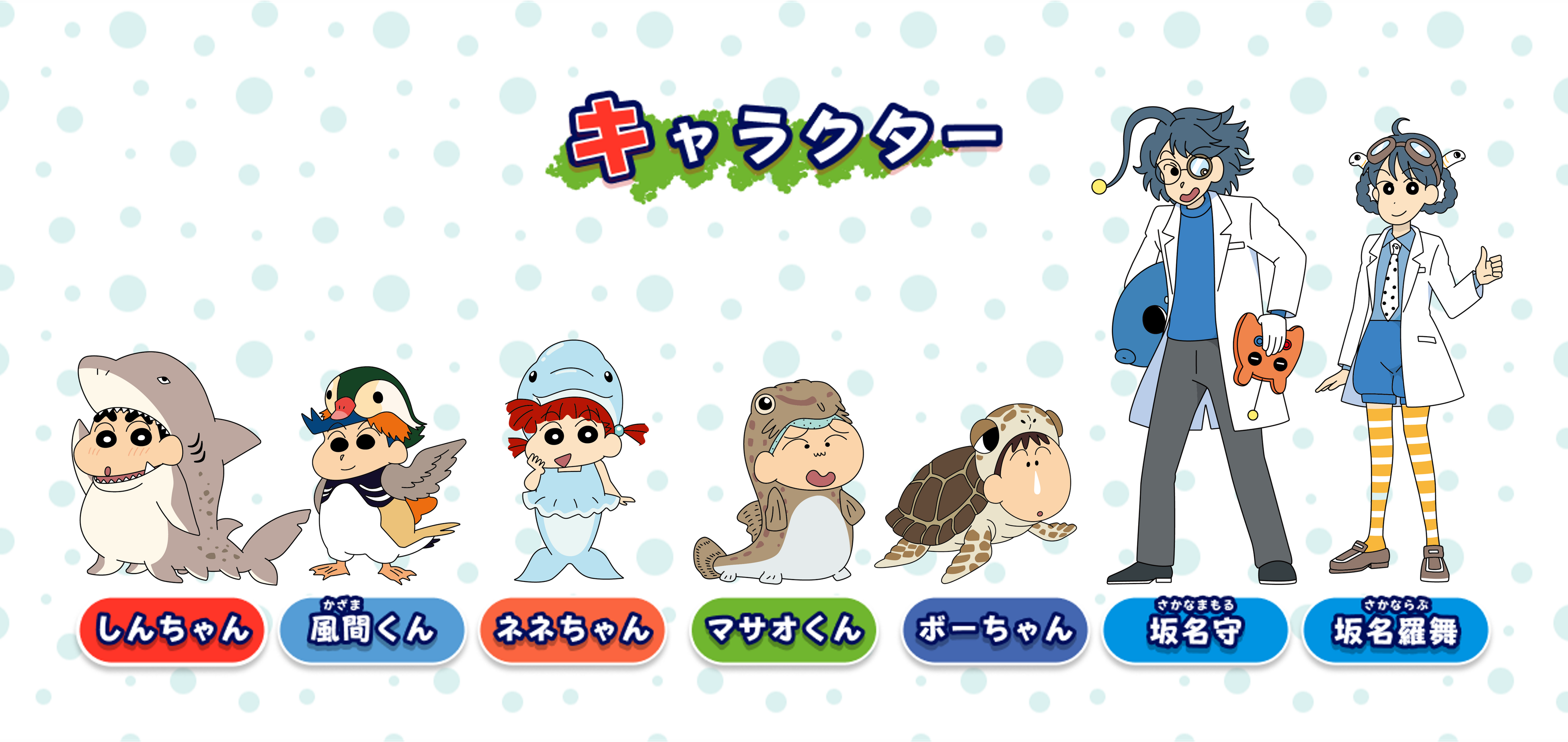 https://real.uminazo.jp/shinchan/osakana-project/ ■Event overview A real-life mystery-solving event featuring the main characters of the popular anime “Crayon Shin-chan,” “The Mystery of the Kasukabe Defense Force and the Human Fish Plan,” will be held at the Marine World Uminonakamichi aquarium in Fukuoka Prefecture from Wednesday, October 29, 2025, to Sunday, March 1, 2026. This hands-on event, where participants are challenged to solve mysteries at an aquarium, will be held for the first time in the Kyushu region. During the event, various collaboration goods will be on sale, and you can fully experience the world of “Crayon Shin-chan” through special explanatory panels and decorations, familiar background music, and Shin-chan’s original voice. The costumes of Shin-chan and the other five members of the Kasukabe Defense Force were designed specifically for this event and feature popular creatures from “Marine World,” such as the grey nurse shark and the finless porpoise. New characters original to the game also appear in the mystery-solving story! We will take on the mystery of the “Human Fish Plan” devised by the genius scientist Sakana Mamoru, who loves aquatic creatures.