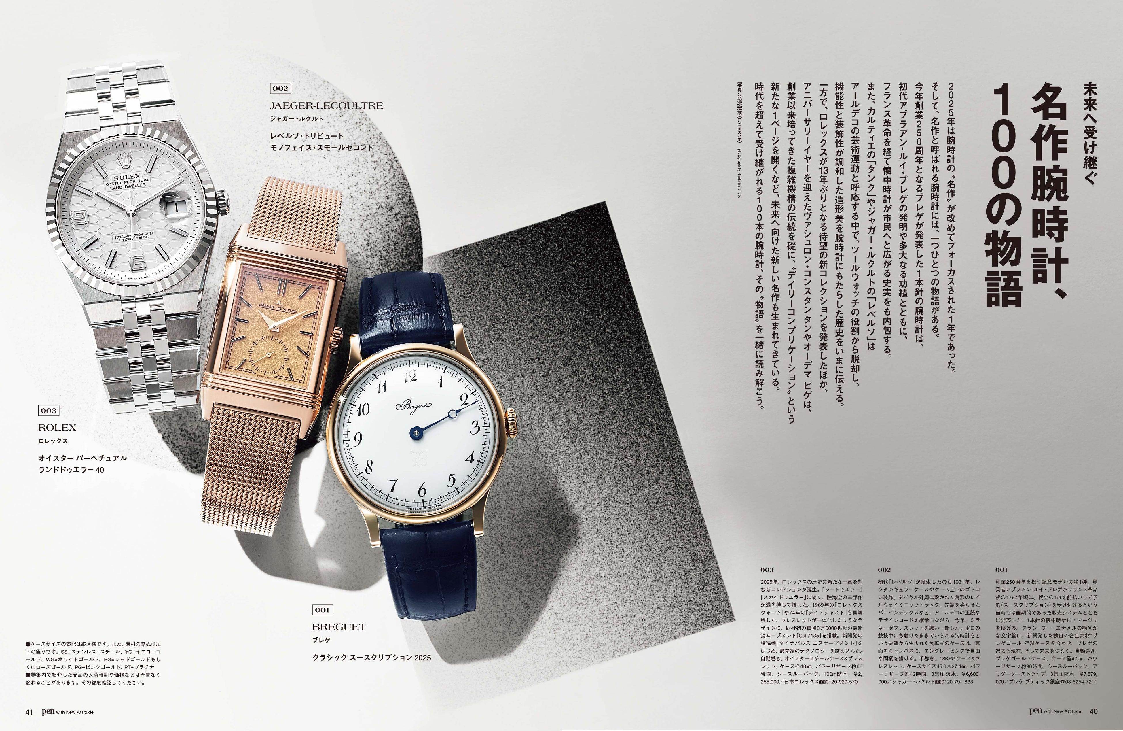 https://prcdn.freetls.fastly.net/release_image/11369/978/11369-978-23d4ad37b1bfaf61f5d4161a372a4ba0-1080×1404.jpg Pen December 2025 Special Edition (on sale October 28th) 2025 was a year in which “masterpiece” watches were once again in focus. And each masterpiece watch has its own story. This year marks the 250th anniversary of Breguet’s founding, and the single-hand wristwatch announced by Breguet In addition to the inventions and significant achievements of the first Abraham-Louis Breguet, It also embodies the historical fact of pocket watches becoming more widely available to the general public after the French Revolution. Also, Cartier’s Tank and Jaeger-LeCoultre’s Reverso In response to the Art Deco artistic movement, they broke away from their role as tool watches, Conveying to the present day the history of bringing aesthetic beauty to wristwatches, combining functionality and decorativeness. Meanwhile, Rolex announced its long-awaited new collection for the first time in 13 years, Vacheron Constantin and Audemars Piguet, celebrating their anniversaries, Building on the tradition of complex mechanisms cultivated since the company’s founding, the company has developed the “Daily Complication” movement. Opening a new chapter, new masterpieces are being born that look toward the future. Let’s unravel the stories of 100 timeless watches. ※Amazon Ranking: No. 1 in Men’s Fashion & Lifestyle (October 22-24, 2025) ●Check it out on Pen Online