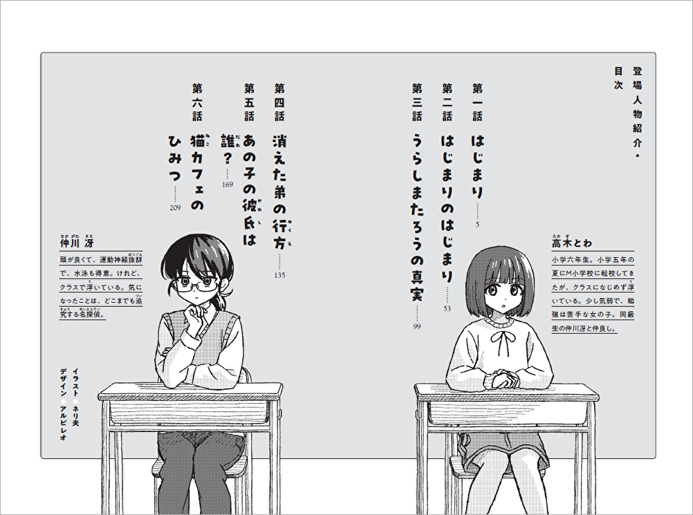 HP]https://misutosho.shufunotomo.co.jp/ ■Synopsis My name is Takagi Towa. I’m in the sixth grade. I transferred to M Elementary School in the fifth grade, and I still haven’t fit in with my class… I’m an outsider in my class, but I’m best friends with Nakagawa Sae, who’s also an outsider! People say I’m weird at school, but when I’m with Nakagawa Sae, I don’t care. That’s because Nakagawa Sae has excellent grades and athletic ability, and she’s a cool girl who can argue back with reason even when classmates and teachers say unreasonable things to her. And he’s a great detective who never misses even the smallest anomaly! A cat cafe full of strangeness, the true identity of the mean teacher, the truth about Urashima Taro… When you’re with Nakagawa Sae, your ordinary daily life becomes filled with mystery. This is the story of a mysterious incident that Nakagawa Sae and I experienced before summer vacation.