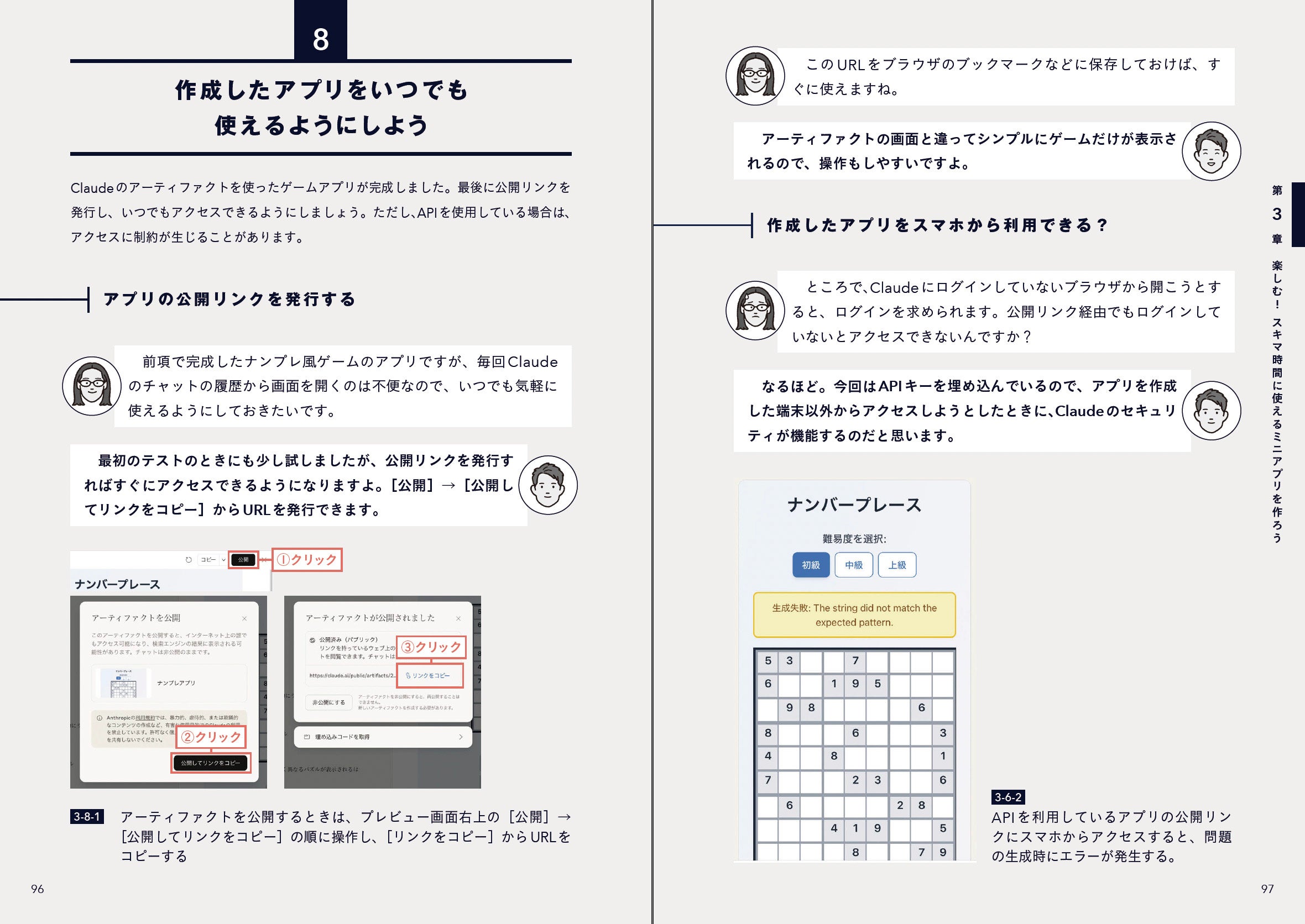 automatically generate it. However, when it comes to developing apps using generative AI, it’s easy to hit obstacles like “I don’t know how to do it” or “I can’t create it the way I want.” This book is a beginner’s guide packed with know-how to help you overcome those obstacles and create the app of your dreams. ■ Learn from experts and realize your dreams. In this book, Mariko Sakai, a writer with no prior experience in app development, develops various apps in dialogue with KEITO, a YouTuber and leading expert in the use of generative AI. The book’s unique feature is that by creating everyday apps, such as your own personalized AI chatbot, an image generation app for social media posts, a Sudoku game app, and an audio diary app, you can have fun while acquiring the knowledge and techniques necessary for generative AI development. Furthermore, since the apps are developed using standard tools such as ChatGPT, Claude, Dify, and Bolt, the knowledge learned in this book can be applied in a wide range of situations. ■This book is recommended for the following people: • Those who want to develop original apps • For those looking for an easy-to-read book on app development • Those interested in app development using generative AI • Those who want to try vibe coding ■Paper image