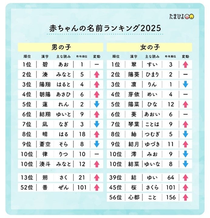 (https://st.benesse.ne.jp/ninshin/name/). Survey Name Tamahiyo Baby Name Rankings 2025 Survey Content Names of babies born between January 1, 2025 and September 15, 2025 Survey Subjects Children of customers who have used “Tamahiyo” products and services (answers are optional) Number of people surveyed 166,011 people (83,839 boys, 82,172 girls) Survey Items Name reading, kanji, etc. *If the same kanji combination has multiple readings, the most common reading will be presented. Survey Name Tamahiyo Child Naming Survey Survey period October 4, 2025 – October 8, 2025 Survey Subjects Tamahiyo app (Mainichi no Tamahiyo) users Number of survey subjects 1,704 people Investigation items 名づけで重視したこと、赤ちゃんの名前の由来など 【ご参考】 ●「たまひよ」名づけ関連商品・サービスのご紹介