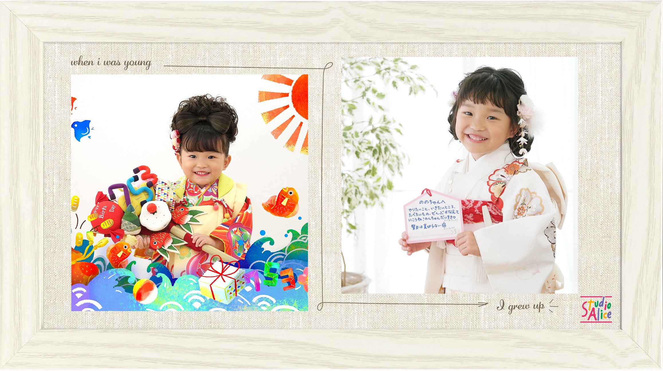 https://www.studio-alice.co.jp/753/ ■[Studio Alice Exclusive] My History Photo A special gift exclusively available to those who have had their photos taken at Studio Alice! The Shichi-Go-San photo taken this time will be combined with a photo taken at Studio Alice when your child was young, all in one frame! We’ll give you a special photo that only Studio Alice can give you. *Purchase conditions apply