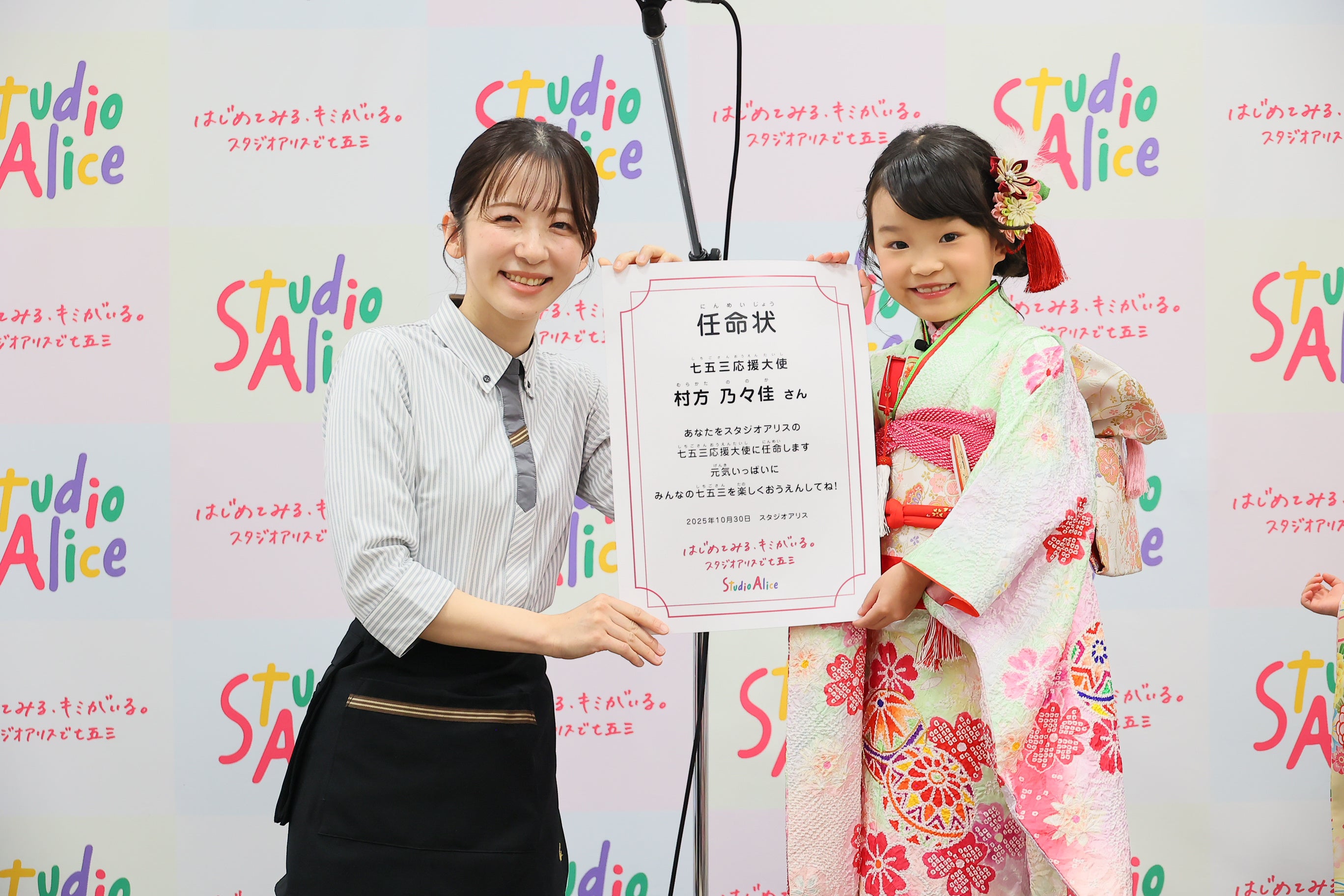 Prefecture; President and CEO: Shunsuke Makino) has been running various communications, including a Shichi-Go-San campaign, since April 2025, under the brand tagline “Try it for the first time, you’re here.” To further promote the Japanese tradition of Shichi-Go-San, we held a press event at Studio Alice Tokyo Opera City on Thursday, October 30, 2025, featuring singer and child actress Nonoka Murakata (hereafter, Non-chan), who turned seven this year, and her younger sister, Hinano (hereafter, Hi-chan). At our company, we not only take photos in our studio, but also value the excitement and extraordinary feeling of Shichi-Go-San, a special day where you can truly experience your child’s growth. At the press event, singer and child actress Nono, who turned seven this year, and her younger sister Hi-chan, who turned three this year, appeared on stage wearing Studio Alice kimonos. To promote Shichi-Go-San, the two were appointed “Studio Alice Shichi-Go-San Support Ambassadors,” and Nono commented, “I hope more people will wear kimonos and visit shrines from now on!” After the support ambassador inauguration ceremony, Nono performed the “Shichi-Go-San Theme Song” live for the first time. During the flip talk that followed, when asked “What do you like about the kimono you’re wearing?” she answered with a smile, “The kimono is colorful, and it makes me look like an older sister!”, showing us that she has grown into an older sister throughout the show. Appointed as “Studio Alice’s Shichi-Go-San Support Ambassador,” Nono-chan and Hi-chan sang the Shichi-Go-San theme song live for the first time The two, who celebrated their Shichi-Go-San this year, have been appointed “Studio Alice Shichi-Go-San Support Ambassadors.” Upon receiving their appointment letters, they commented with beaming smiles, “I’m so happy!” Nono also commented on turning seven this year, “It’s sad to say goodbye to Shichi-Go-San, but the ladies at Studio Alice were so kind to me during this shoot, and it was a fun Shichi-Go-San!”
