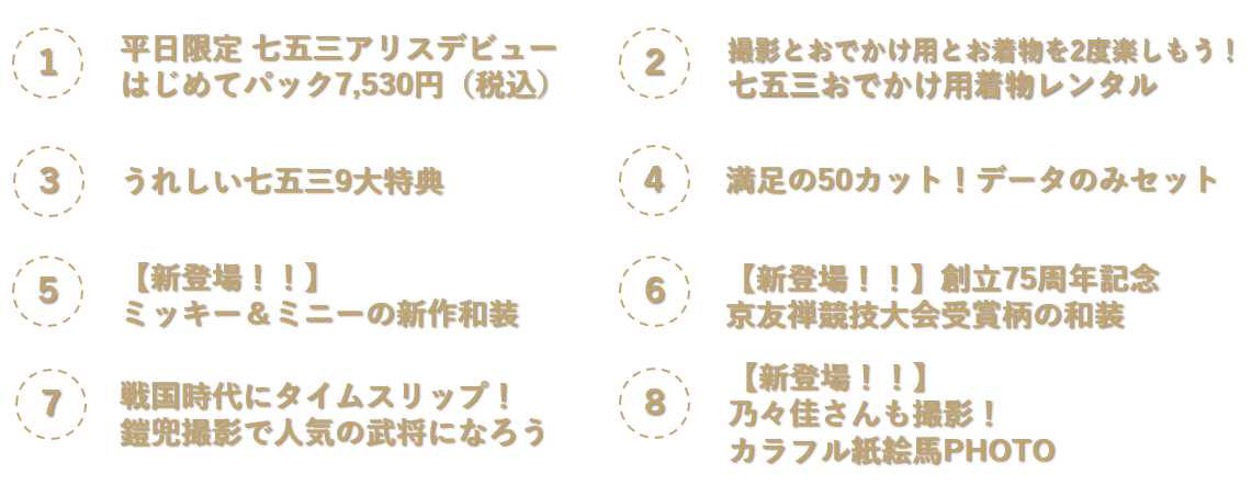 opportunity, but as a valuable experience that the whole family can enjoy wholeheartedly and see for the first time how their child has grown. Please keep an eye on Studio Alice’s new brand tagline for Shichi-Go-San, “See it for the first time, you’re here,” and our future plans for Shichi-Go-San. ■Studio Alice’s 8 Shichi-Go-San Topics (until December 31, 2025)