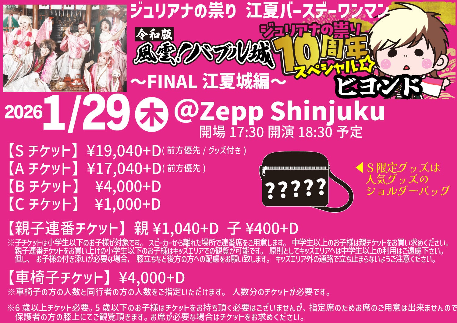 https://prcdn.freetls.fastly.net/release_image/45795/26/45795-26-a6ecc10d330e29436323b0e9b6d8bf81-1500×1060.jpg ▪️Event Details Title: Juliana’s Curse Solo Performance Reiwa Version: Stormy Bubble Castle: Juliana’s Curse 10th Anniversary Special ☆ Beyond ~FINAL Enatsu Castle Arc~ Date: Thursday, January 29, 2026 Venue: Zepp Shinjuku (TOKYO) Time: Doors open at 5:30 PM, show starts at 6:30 PM (scheduled) Pre-show merchandise sales: 4:00 PM – 5:00 PM (scheduled) ▪️Ticket types S Ticket ¥19,040 (tax included) *drink not included, includes limited edition merchandise/priority seating at the front A Ticket ¥17,040 *drink not included, priority seating at the front B Ticket ¥4,000 *drink not included Ticket C: ¥1,000 (drinks not included) Parent-child consecutive tickets: Parent: ¥1,040, Child: ¥400 (drinks not included) Wheelchair ticket: ¥4,000 (drinks not included) ▪️Ticket Sales Schedule <General> General advance lottery first round (S) 2025/10/31 (Friday) 10:00-2025/11/9 (Sunday) 23:59 General sales (A, B, C, parent and child wheelchairs) 2025/11/14 (Friday) 10:00-2026/1/15 (Thursday) 23:59 CN play guide
