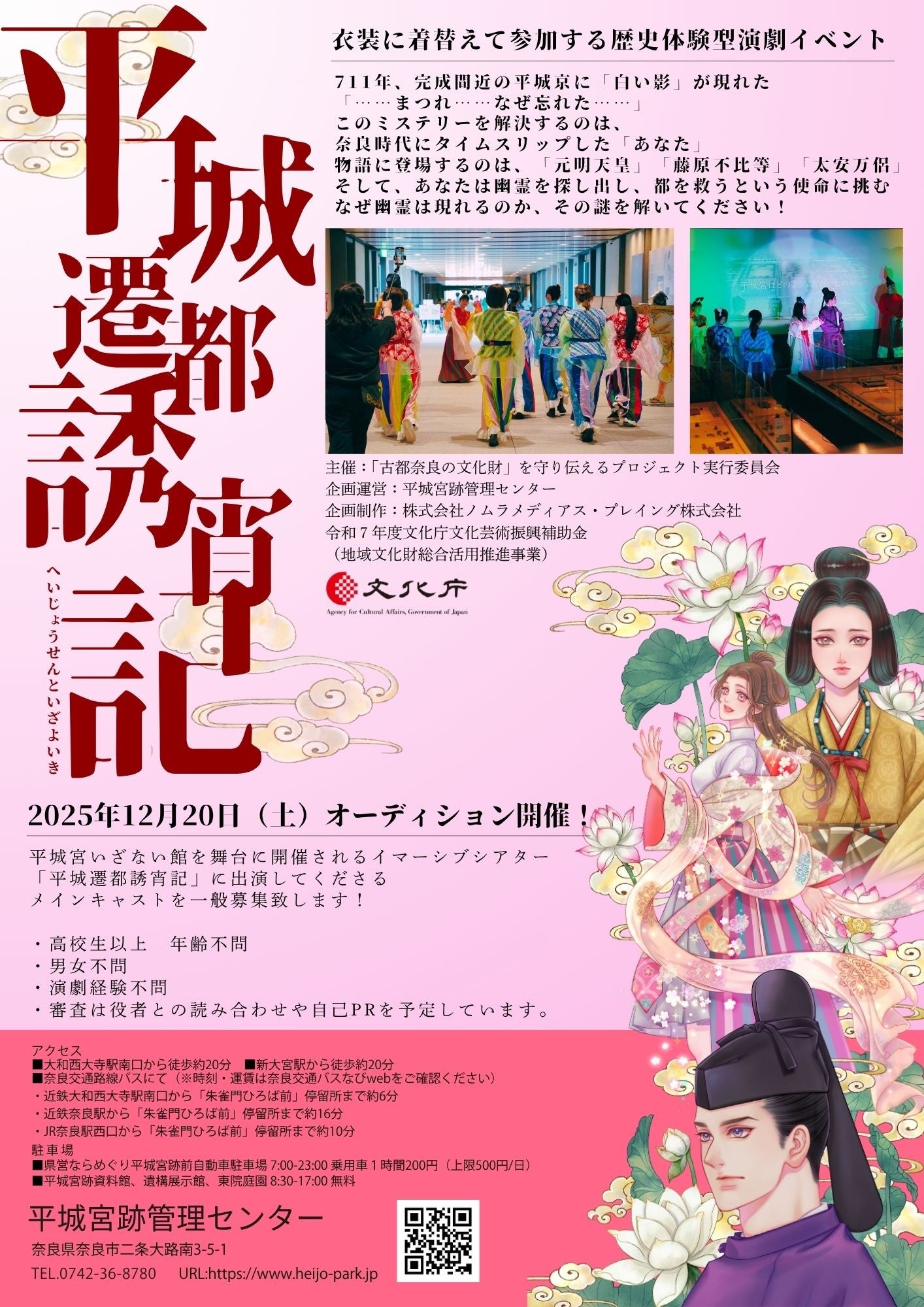 https://prcdn.freetls.fastly.net/release_image/152734/12/152734-12-7ba4714cd65507fad0a3c4dae18fd95d-1414×2000.jpg Back of the flyer for the Heijo Palace Izanaikan at Heijo Palace Ruins Historical Park for events held after November 9, 2025 Title: Heijo Palace Ruins Historical Park, Heijo Palace Izanaikan, Entabii (R) “Heijo Capital Relocation Invitation Chronicle” Venue: Heijo Palace Ruins Historical Park Heijokyo Izanaikan (Nara City, Nara Prefecture) Date and time: Saturday, October 4, 2025 11:00-/13:00-/15:00- November 9, 2025 (Sunday) 11:00-/13:00-/15:00- February 28, 2026 (Saturday) 11:00-/13:00-/15:00- Saturday, March 21, 2026 11:00-/13:00-/15:00- *Scheduled performance time: 60 minutes. Participation Fee: Free Pre-registration: Telephone or website event application form https://www.heijo-park.jp/event/entabi_at_heijo1109/ Heijo Palace Ruins Management Center 0742-36-8780 Organizer: “Historic Nara Cultural Assets Preservation and Preservation Project Executive Committee” Planning and Management: Heijo Palace Site Management Center Reiwa 7 Agency for Cultural Affairs Cultural Arts Promotion Subsidy (Regional Cultural Asset Comprehensive Utilization Promotion Project) Planning and Production: Nomura Medias Co., Ltd., Playing Co., Ltd. ↑↑↑We welcome coverage of the above events, so please come and experience them for yourself! ↑↑↑ Entab(R) “Heijo-to Relocation Invitation Chronicle” Audition Overview Recruitment Name: Entab(R) Heijo-to Relocation Invitation Chronicle Performer Auditions Venue: Heijo Palace Ruins Historical Park, Heijo Palace Izanaikan (Nara City, Nara Prefecture) Date and Time: Saturday, December 20, 2025 *The time will be announced only to applicants and members of the press who have made inquiries. Target: ・High school students and above, all ages ・Gender doesn’t matter ・No theater experience required Evaluation Method: Scheduled for a reading session with actors and a