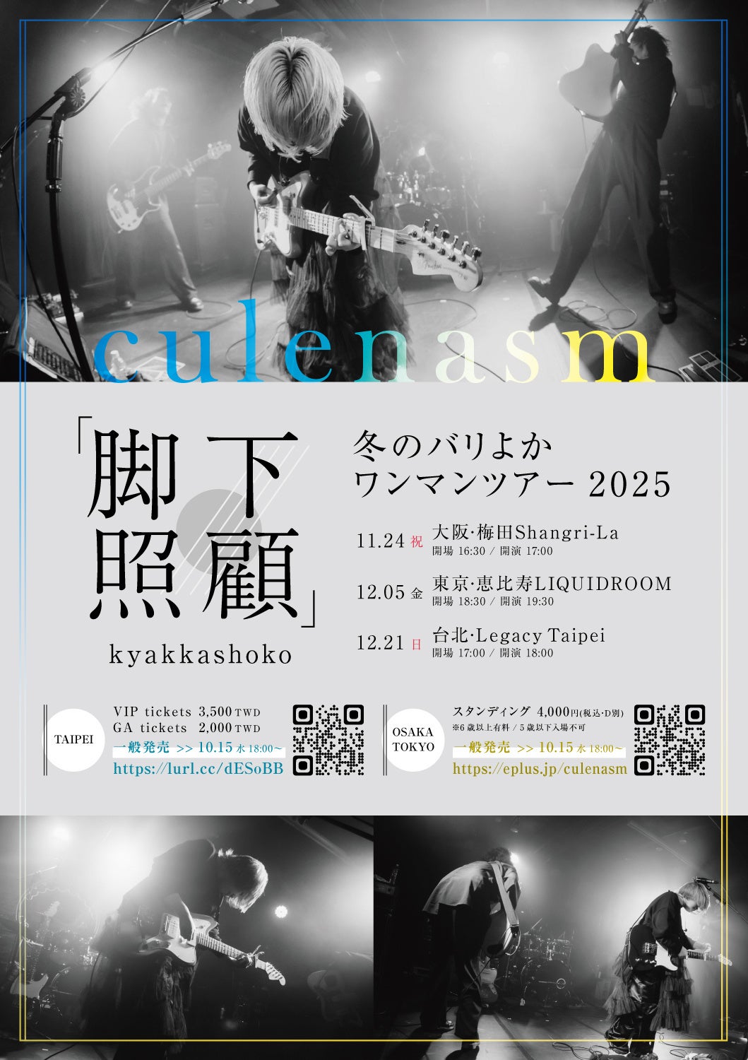 https://prcdn.freetls.fastly.net/release_image/55377/1526/55377-1526-928deb659f02bad0cc5c8be4c865f6fd-1059×1500.jpg November 24th (Holiday) Osaka Umeda Shangri-La December 5th (Friday) Ebisu LIQUIDROOM December 21st (Sunday) Taipei Legacy Taipei Tickets Tokyo, Osaka https://eplus.jp/culenasm/ Taiwan