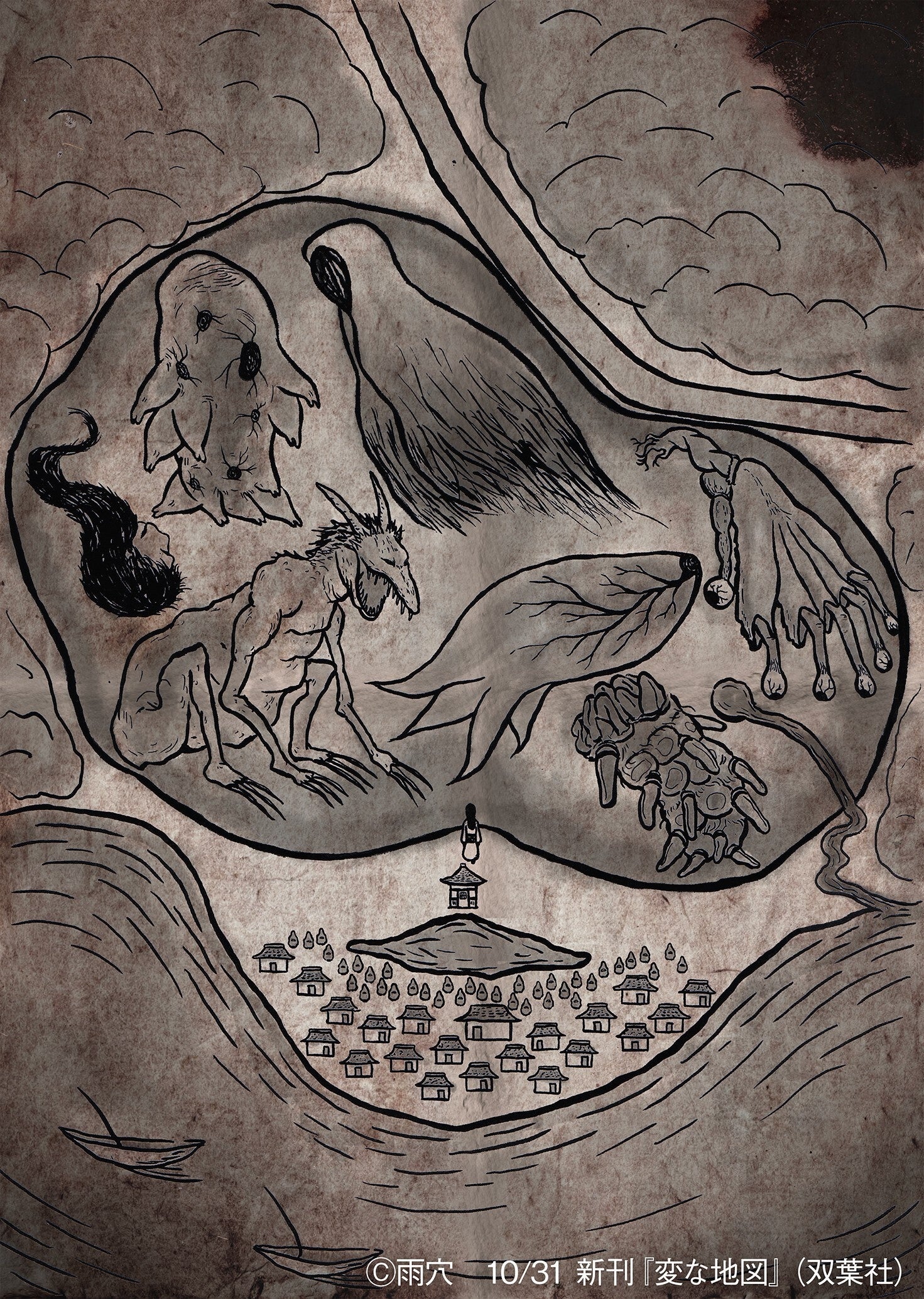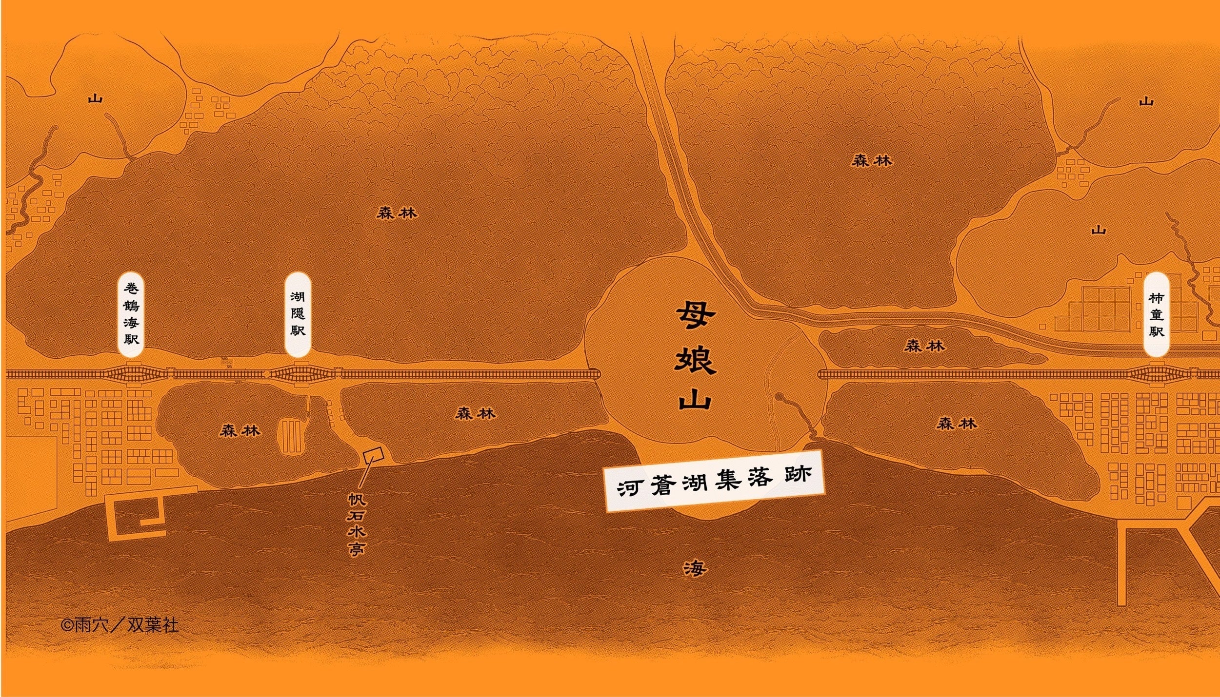 mysterious, yokai-like creatures, the entire study map is unified in a bright orange color. In the center are the words “Haha-Nijo Mountain” and “Kasou-Ko Village Ruins,” which likely hold the key to the story. The shapes of the two mountains, the land stretching out into the sea, and the river flowing from the mountains—does this composition seem familiar? Surrounding the area are a string of strange station names, including “Makizuruumi Station,” “Kogakure Station,” and “Kakido Station,” and terrain resembling forests, towns, and fishing ports is scattered throughout. Among the signs, the most eye-catching are the words “Hosekisuitei.” What on earth is going to happen there? Furthermore, in the nearby forest, an inexplicable “structure” can be seen. What connection does this have to the story? The “Weird Extra-Large Map of Thought,” which measures a whopping 33cm when unfolded, can be opened and closed repeatedly as you read through the pages. You can unravel the story by tracing the paths the characters took and what they saw where. “Is there something strange about this road?” “Are the station names somehow related?” Such small