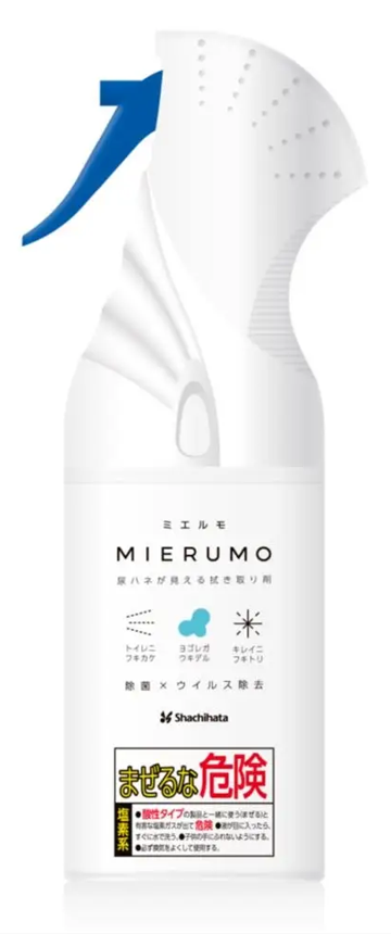 contamination https://www.youtube.com/watch?v=a44kHDaOZ5w Video 2. Visualizing and utilizing the effectiveness of high-concentration hypochlorous acid https://www.youtube.com/watch?v=w1XOOkEsSBQ ●About “MIERUMO,” a product that uses hypochlorous acid “MIERUMO” is a toilet spray that, when sprayed into the toilet, highlights hard-to-notice urine splashes in a blue light, allowing them to be wiped away for easy cleaning. By making urine splashes visible, you can wipe away the source of the odor without missing a beat. The impetus for development came from an employee who commented, “I cleaned the toilet, but for some reason it still smells.” In response to this concern, a planning manager suggested, “Wouldn’t it be great if we could use Shachihata’s ink technology to reveal the source of the odor?” This led to the development of this product. The result was a visualization technology (international patent pending) that uses a colorant and an erasing agent (sodium hypochlorite) and a two-liquid pre-mixing method. You can easily wipe away any visible dirt.